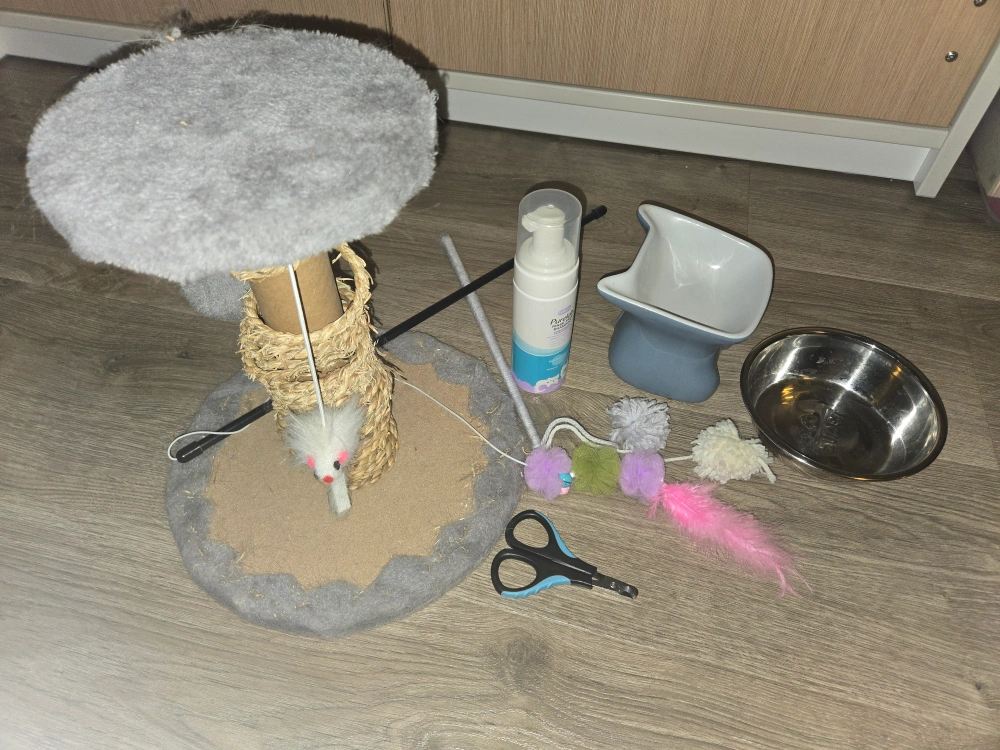A collection of cat supplies including a cat tree, food and water bowls, various toys, and cat grooming foam