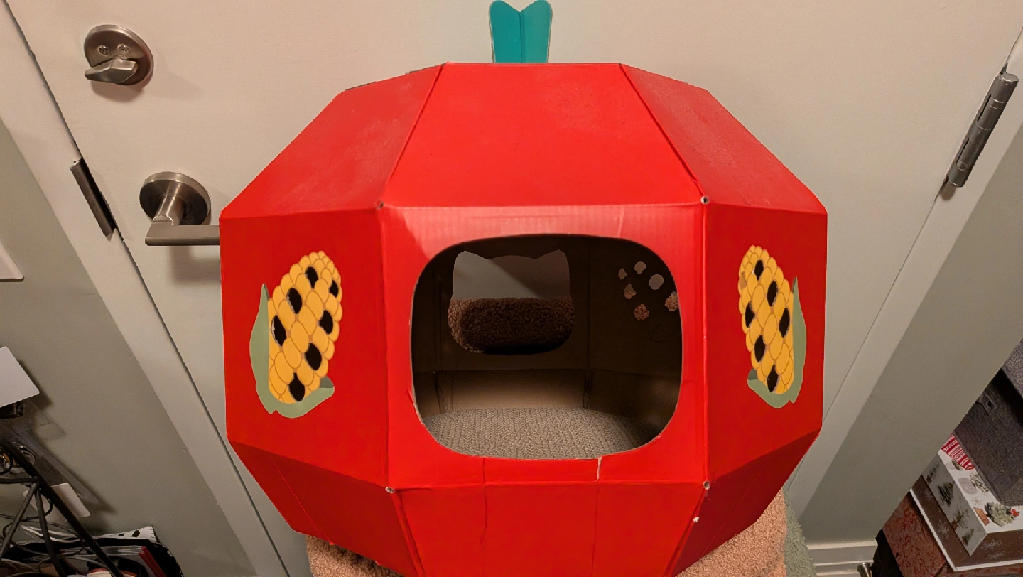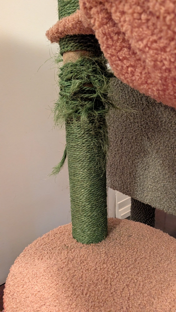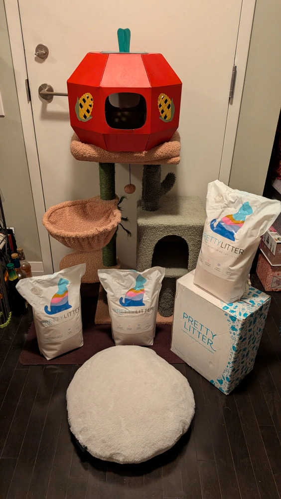 Selling a cat cave and a cat tree, small bowl and cushion. The cat cave is red and shaped like a tomato. The cat tree is green, grey, and peach coloured. ($60 on Amazon) Issues with one post losing rope, see pic Pretty Litter bags $25 each