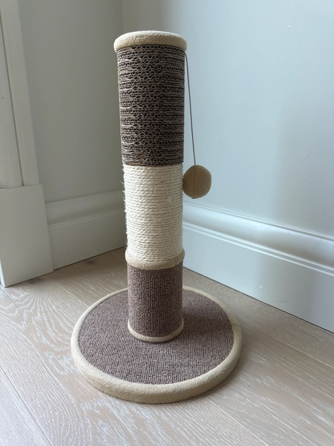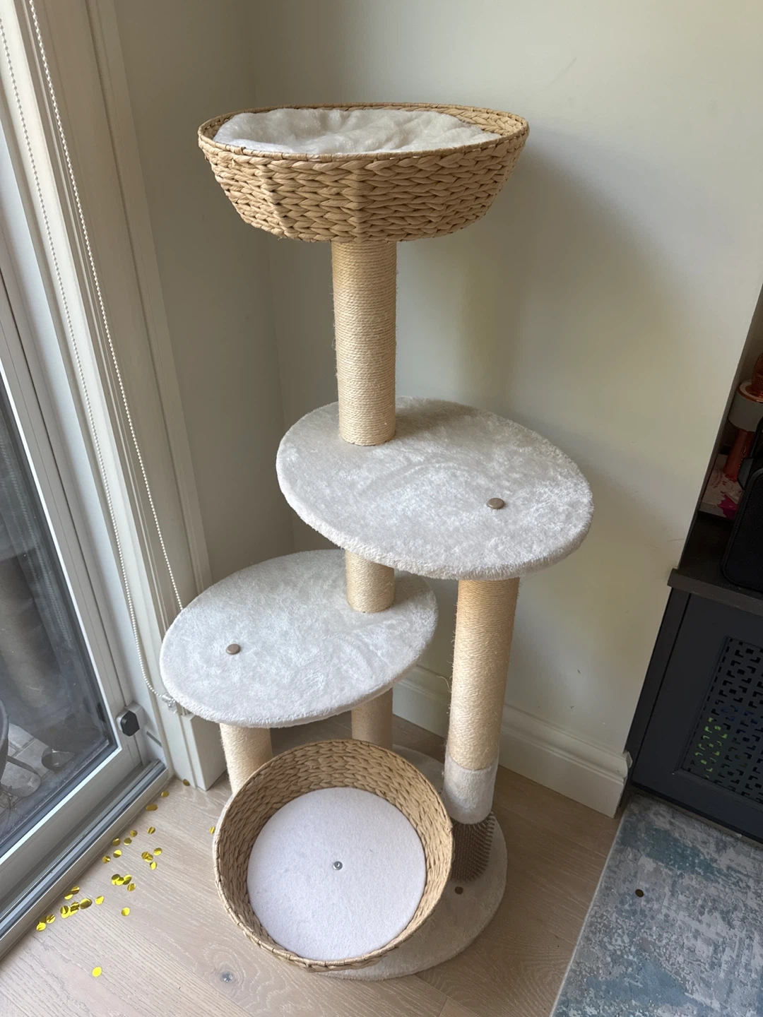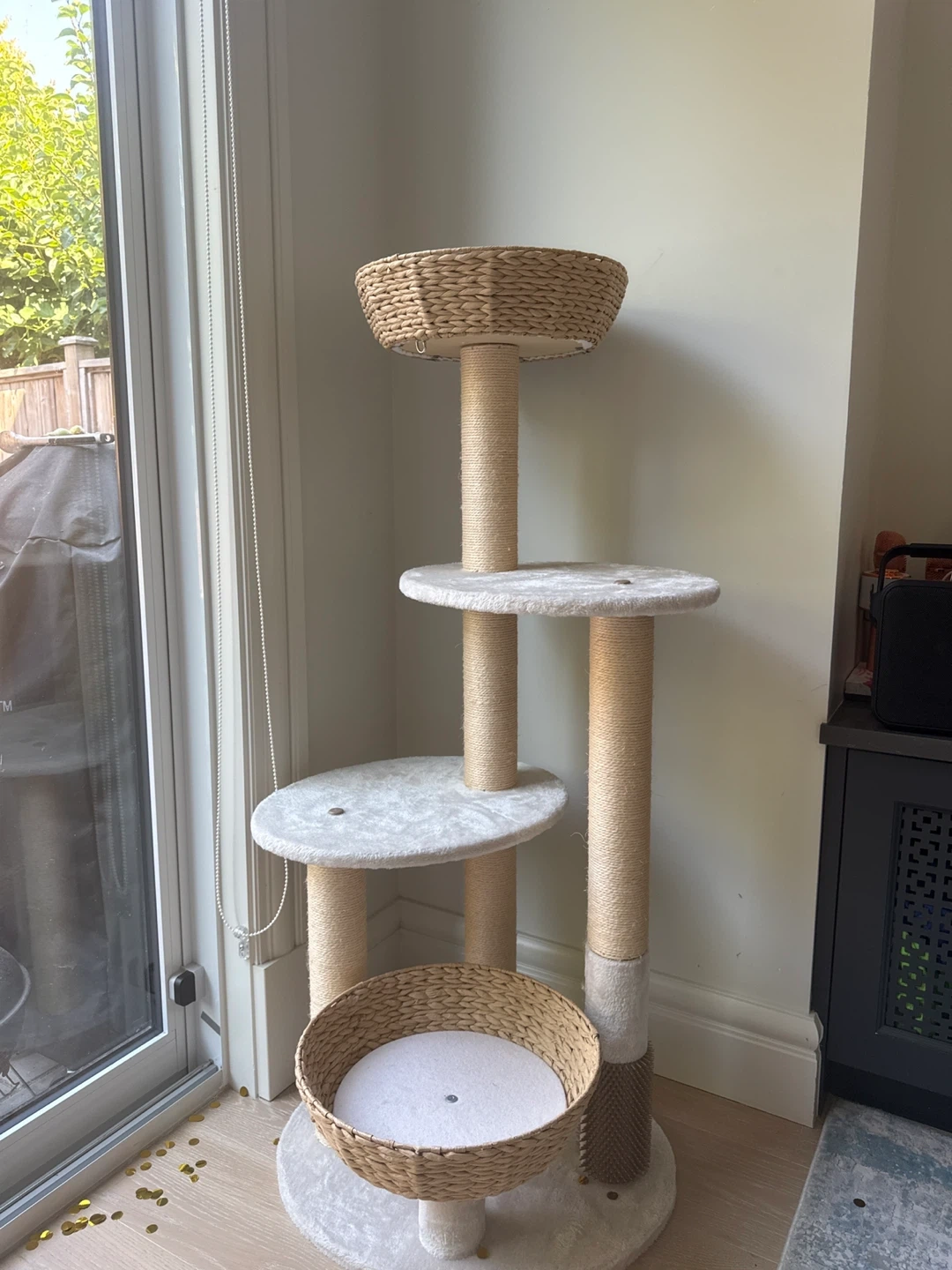 Selling a cat tree with multiple levels for your furry friend to explore and relax on. It features scratching posts wrapped in rope, perfect for keeping their claws healthy and your furniture safe! Also including a grey cat cave and a pillow