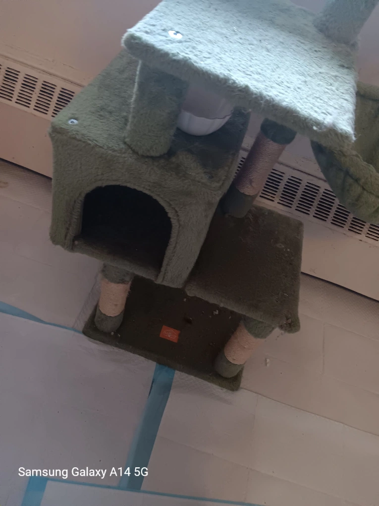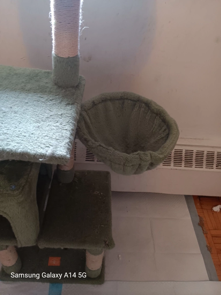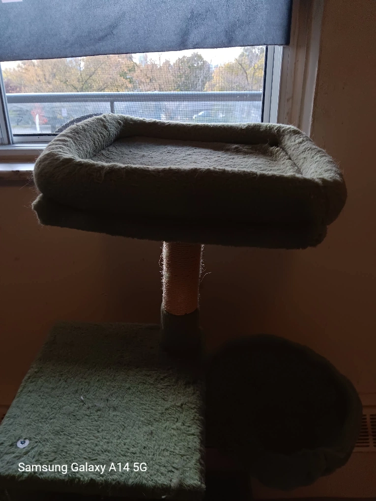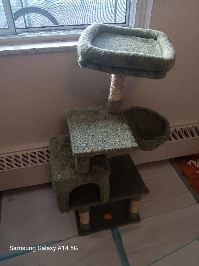Selling a gently used cat tree! It features multiple levels, a cozy condo, a comfy basket, and a scratching post for your furry friend to enjoy. It's in good condition and ready for a new home just needs a bit tightening. 647-203-0411
