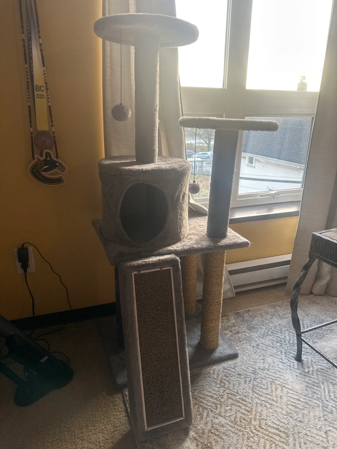 65Selling a cat tree with a scratching post! It has multiple levels for your cat to explore and relax on. The scratching post is great for keeping their claws healthy and your furniture safe. It's in good condition and ready for a new home