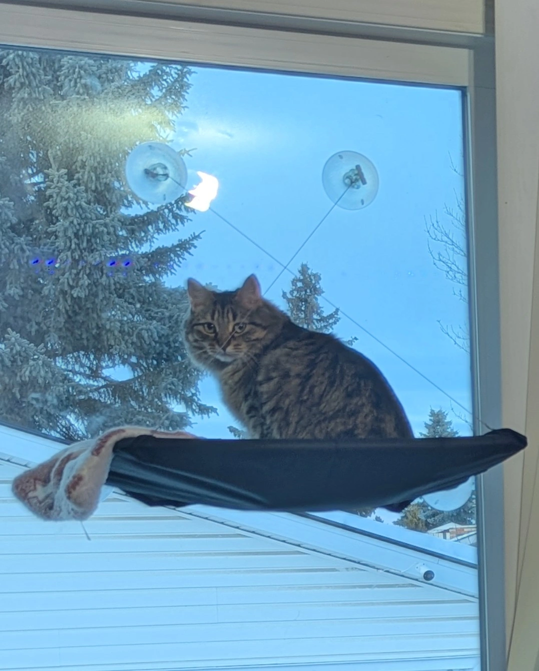 Selling a cat window perch hammock! It's a great way for your cat to enjoy the view and get some sun. It attaches to the window with suction cups