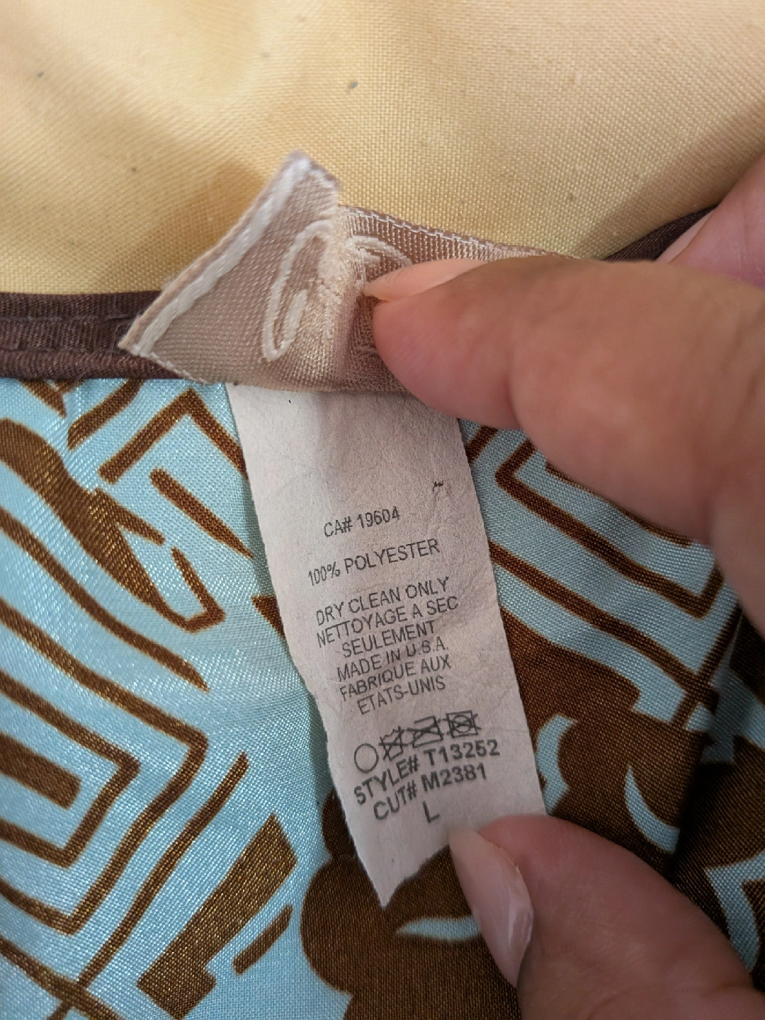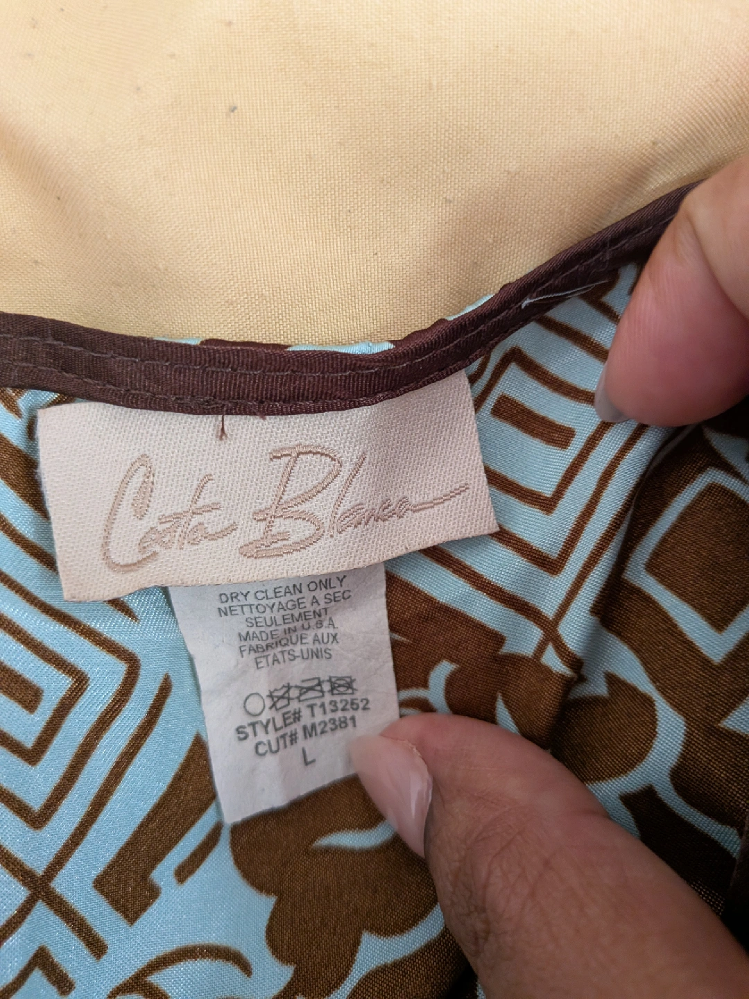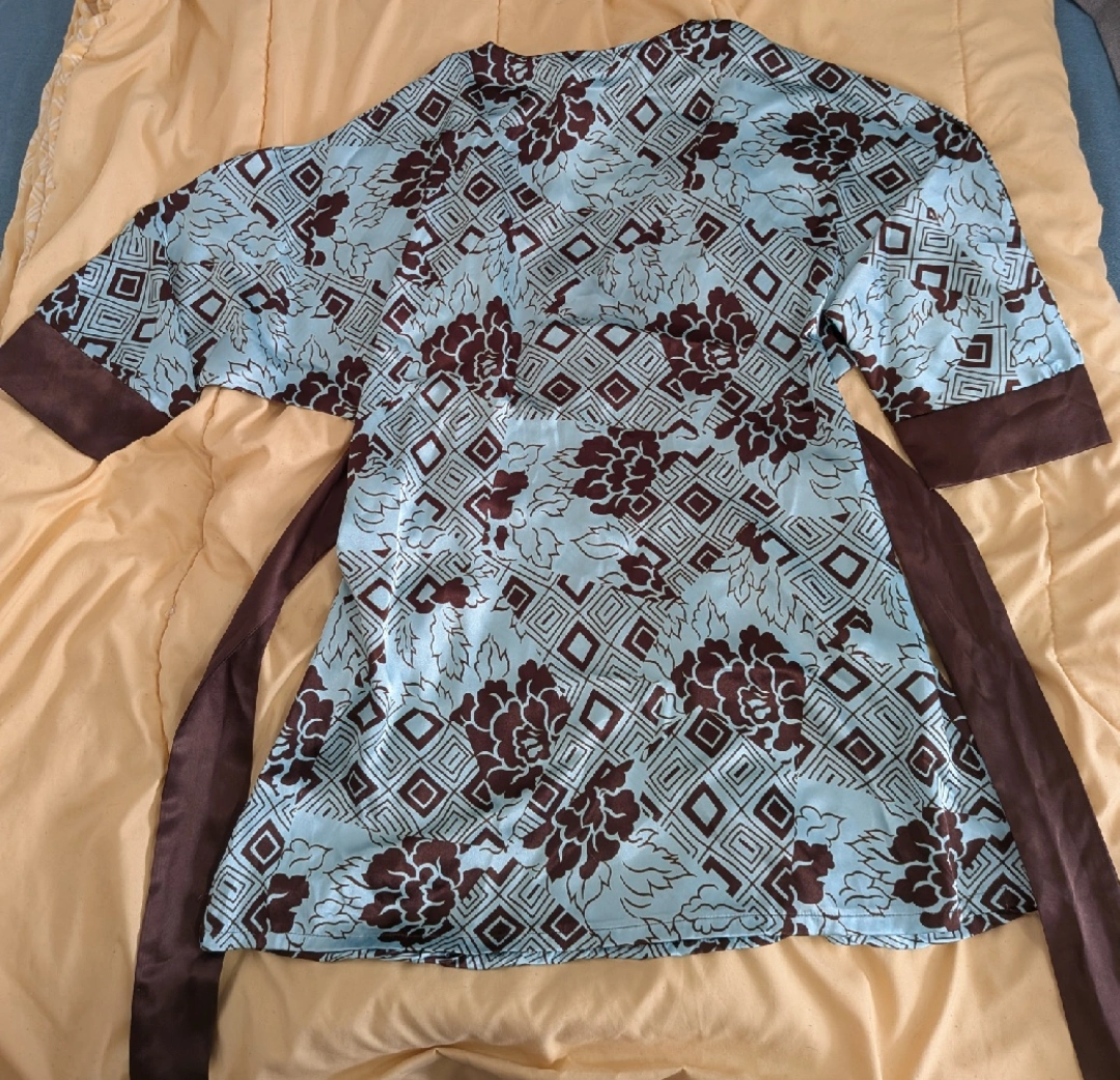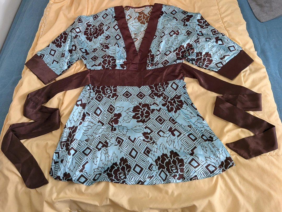 Selling a gently used Cata Blanca kimono-style top. It's a size large and features a beautiful blue and brown pattern. The material is 100% polyester. Dry clean only