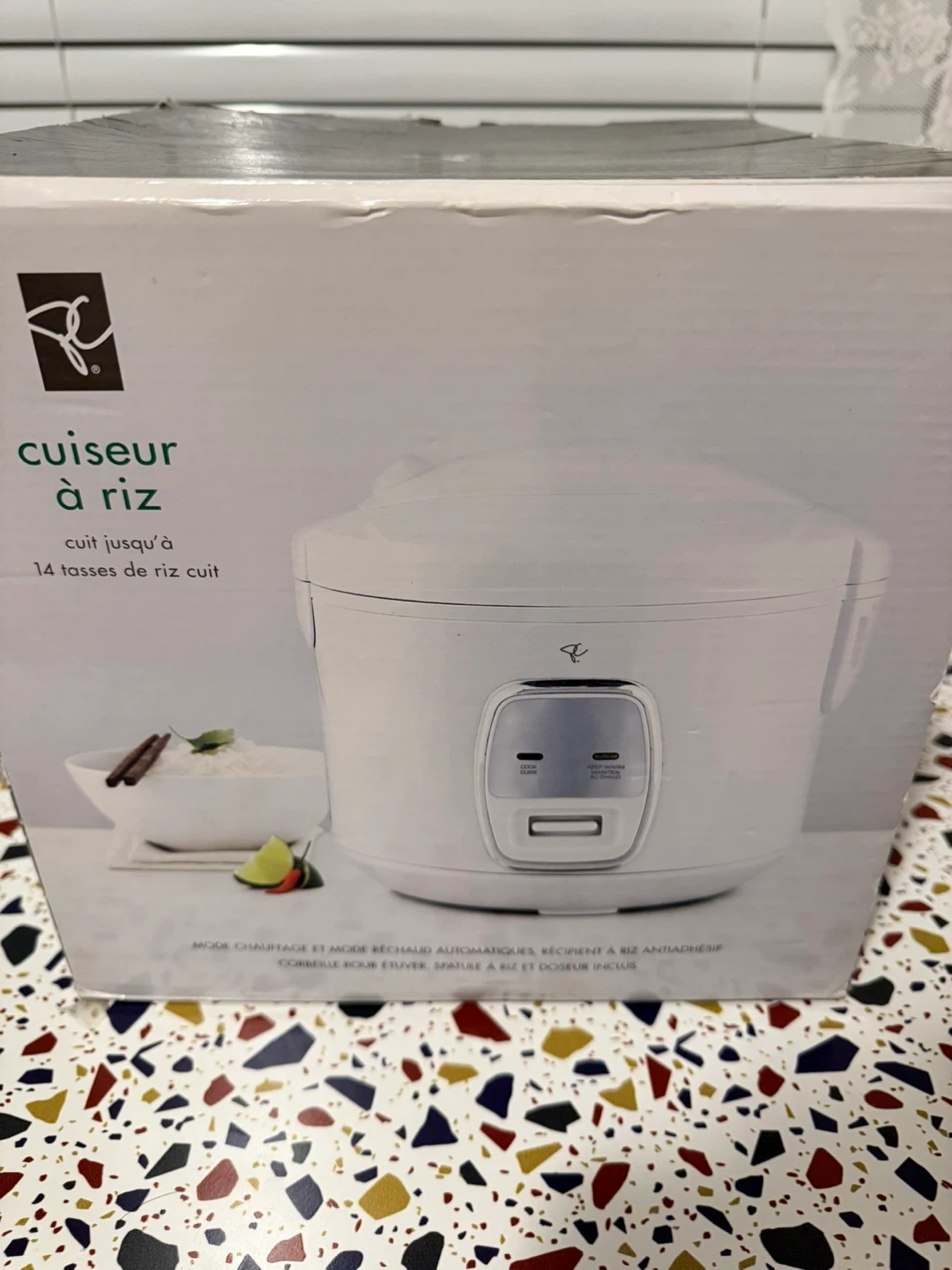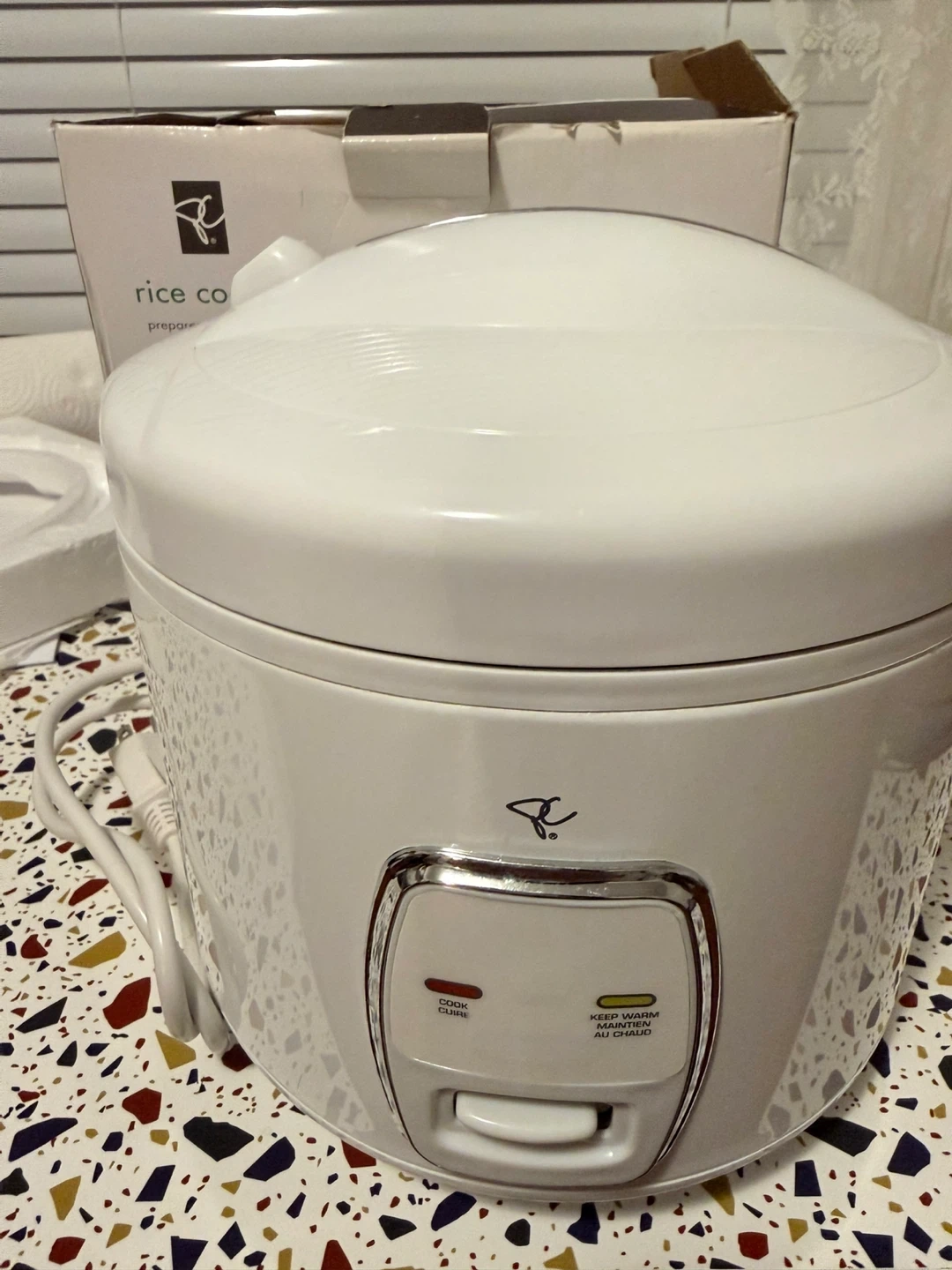 This white Proctor Silex rice cooker prepares up to 14 cups of cooked rice. It has a non-stick bowl and includes a steamer basket and measuring cup. Cooks rice and keeps it warm!