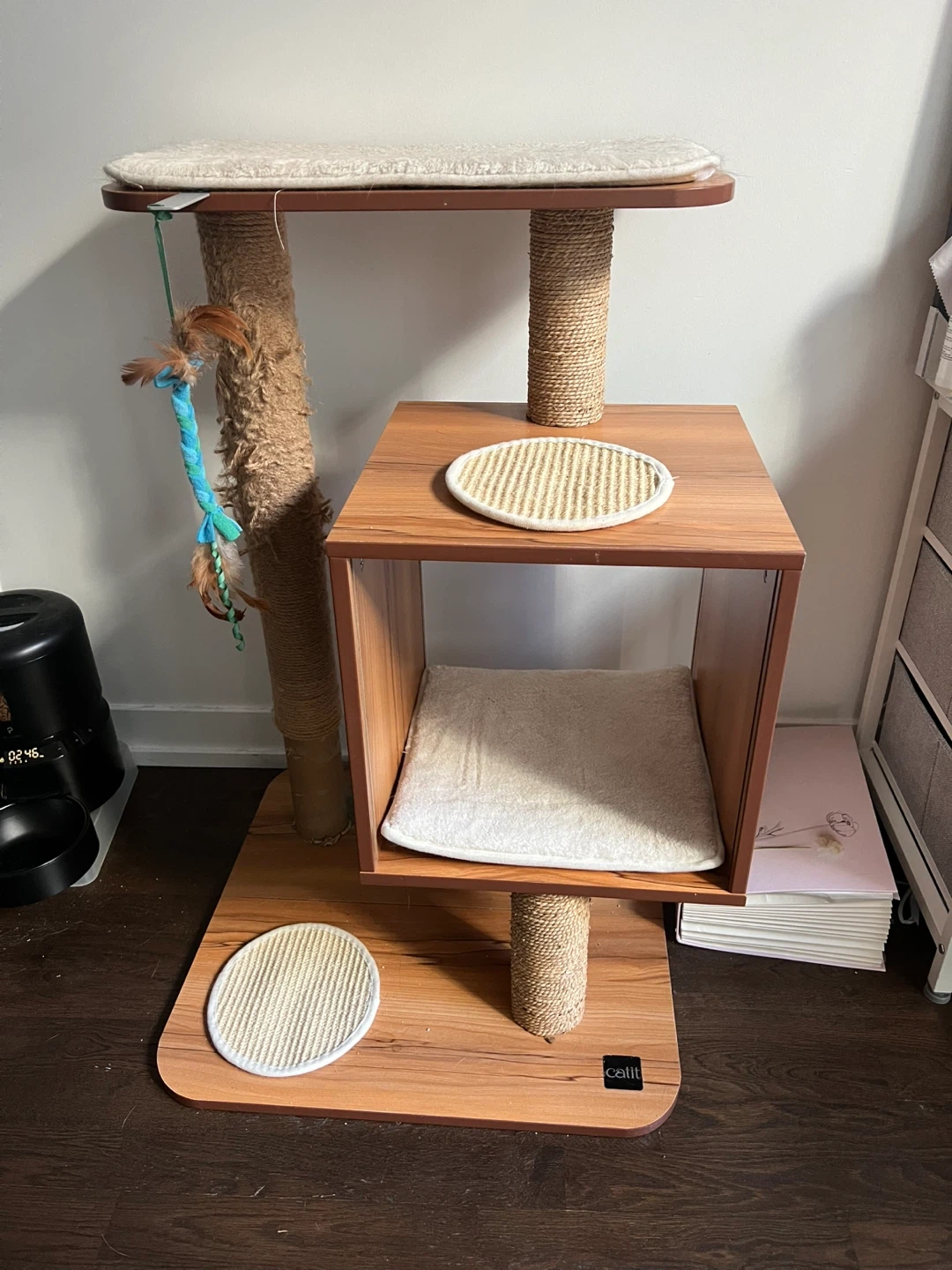 Selling a Catit cat tree condo in a wood grain finish! It's in great condition and provides a fun and comfortable space for your feline friend to play and relax. Features multiple levels with scratching posts and cozy platforms