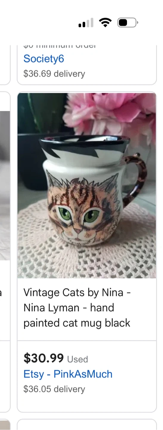 Here’s a cute vintage mug by Nina Lyman, featuring a hand-painted cat design. It's in great shape and ready for a new home!