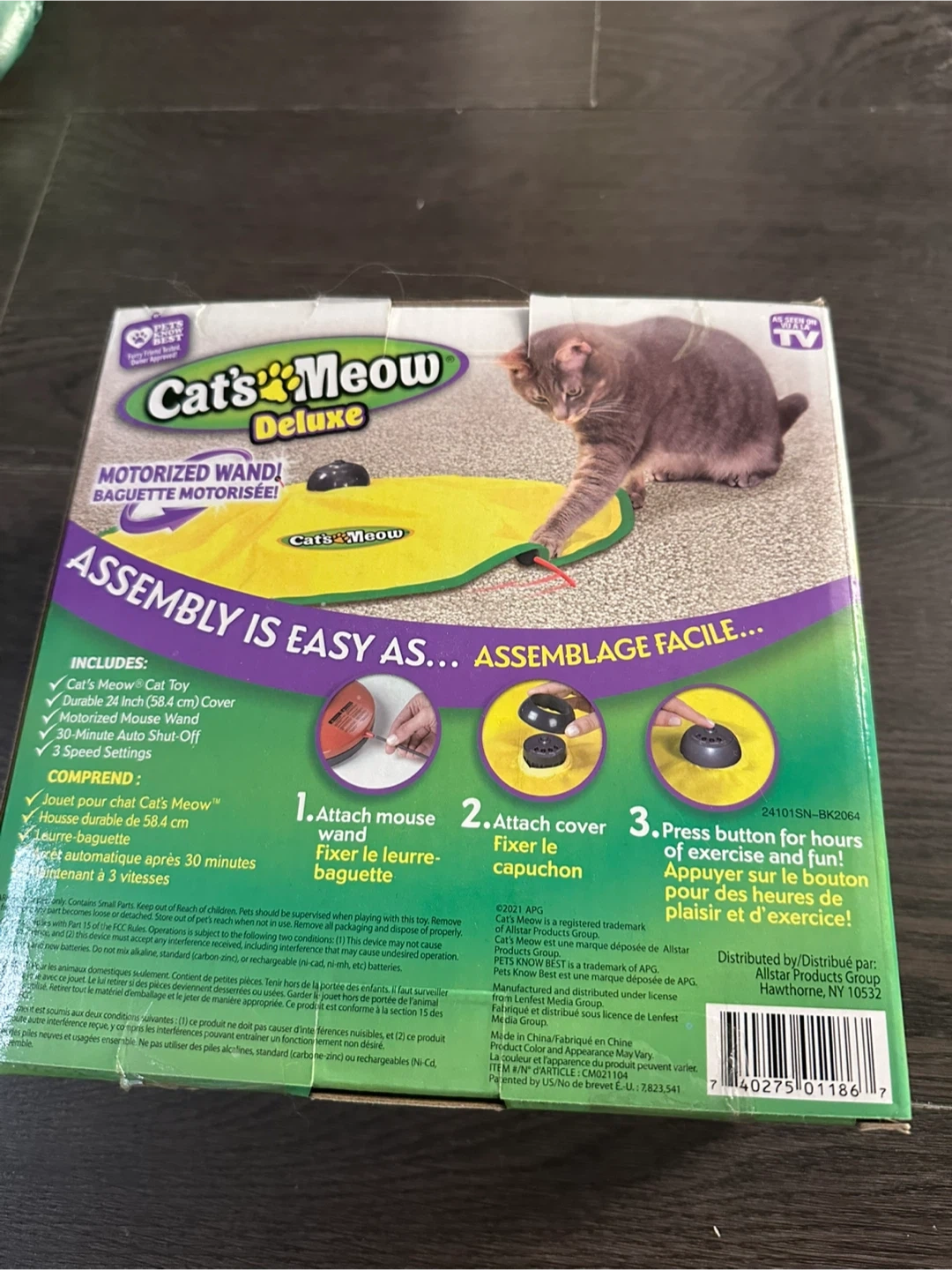 20Looking to keep your kitty entertained? This Cat's Meow Deluxe cat toy is just the thing! It features a motorized wand with 3 speed settings to keep your cat engaged. It also has a 30-minute auto shut-off. Assembly is easy!