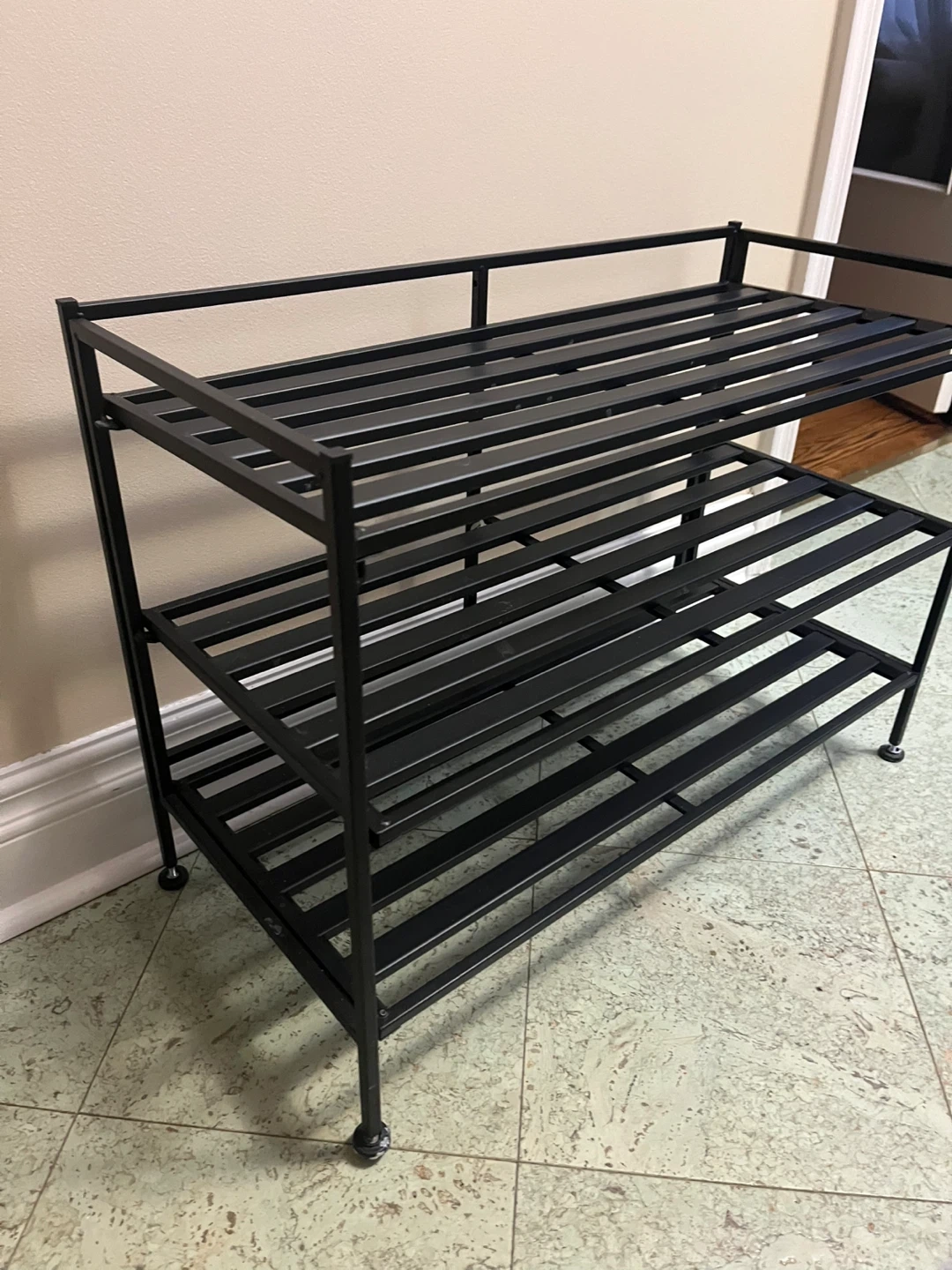 This is a three-tier shoe rack made of black metal. It's designed with slatted shelves for ventilation. It's great for organizing footwear by the door or in a closet.