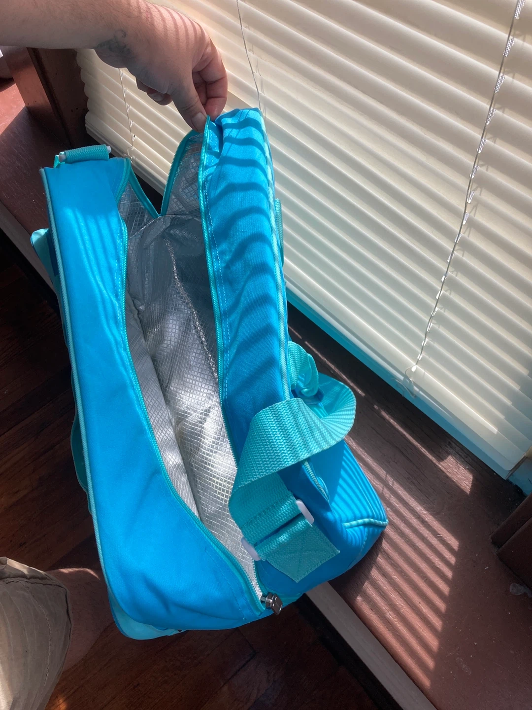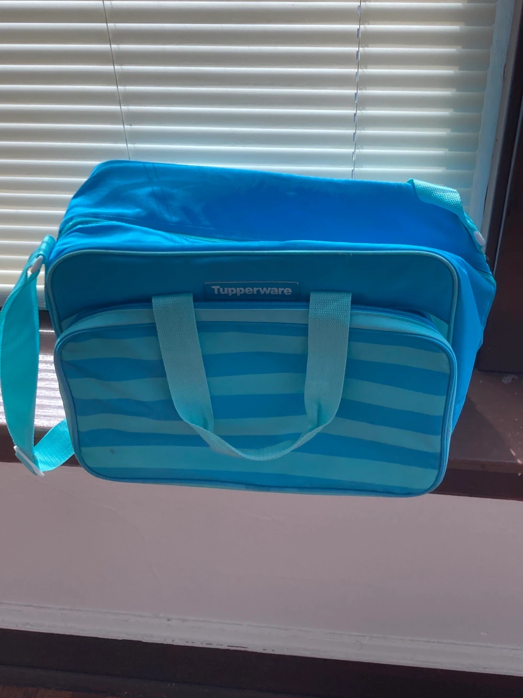 This is a blue insulated lunch bag from Tupperware. It's perfect for keeping your food cool. The bag has a zippered main compartment and an additional zippered front pocket.