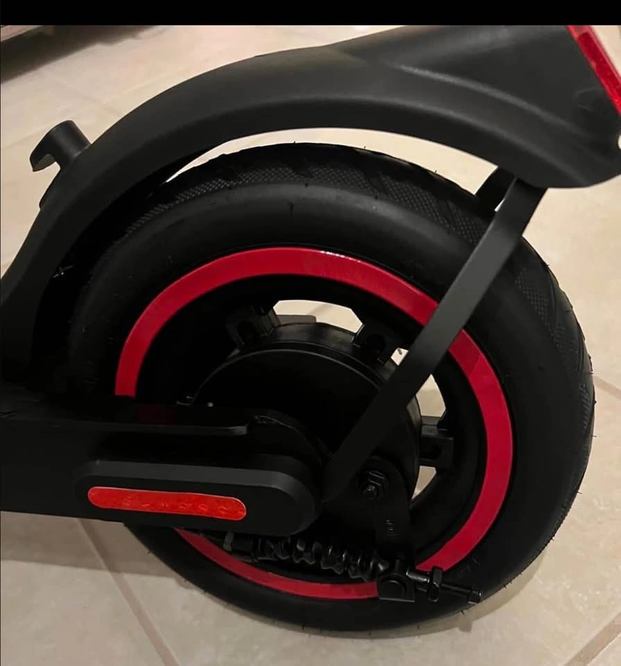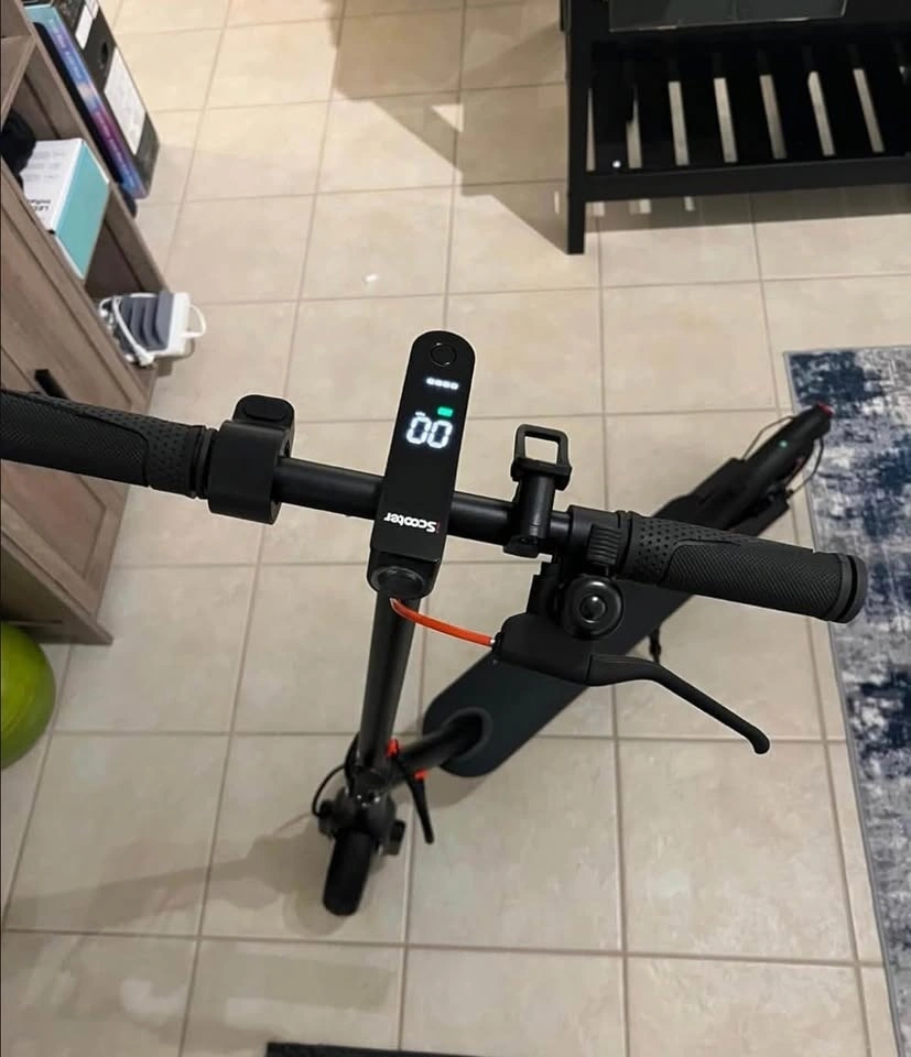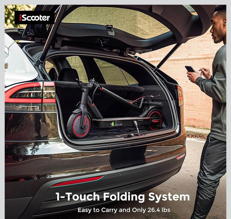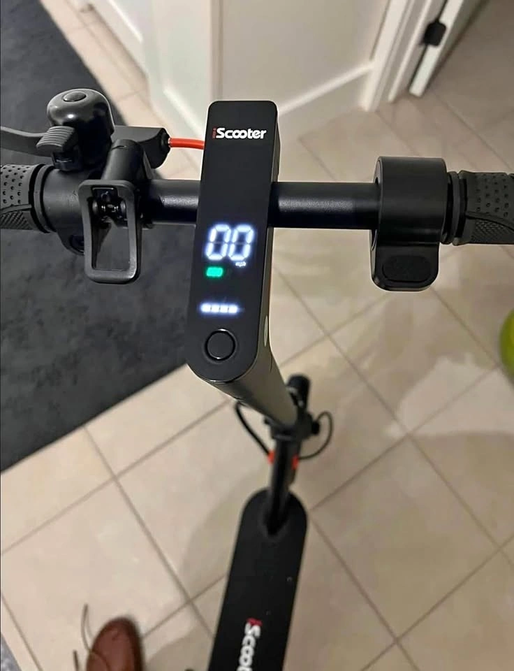 Brand new, still in the box. This is a 350W iScooter electric scooter in black with red accents on the wheels. It has a digital display on the handlebars and a bell. Super fun for cruising around.