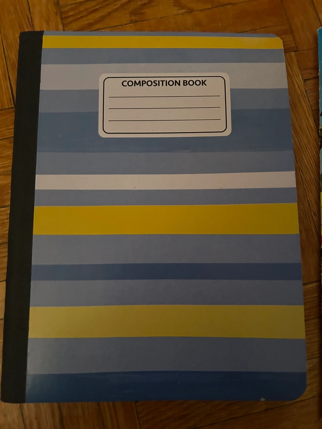 Unused composition notebook. Wide ruled paper. Blue and yellow striped cover. Perfect for school or journaling.