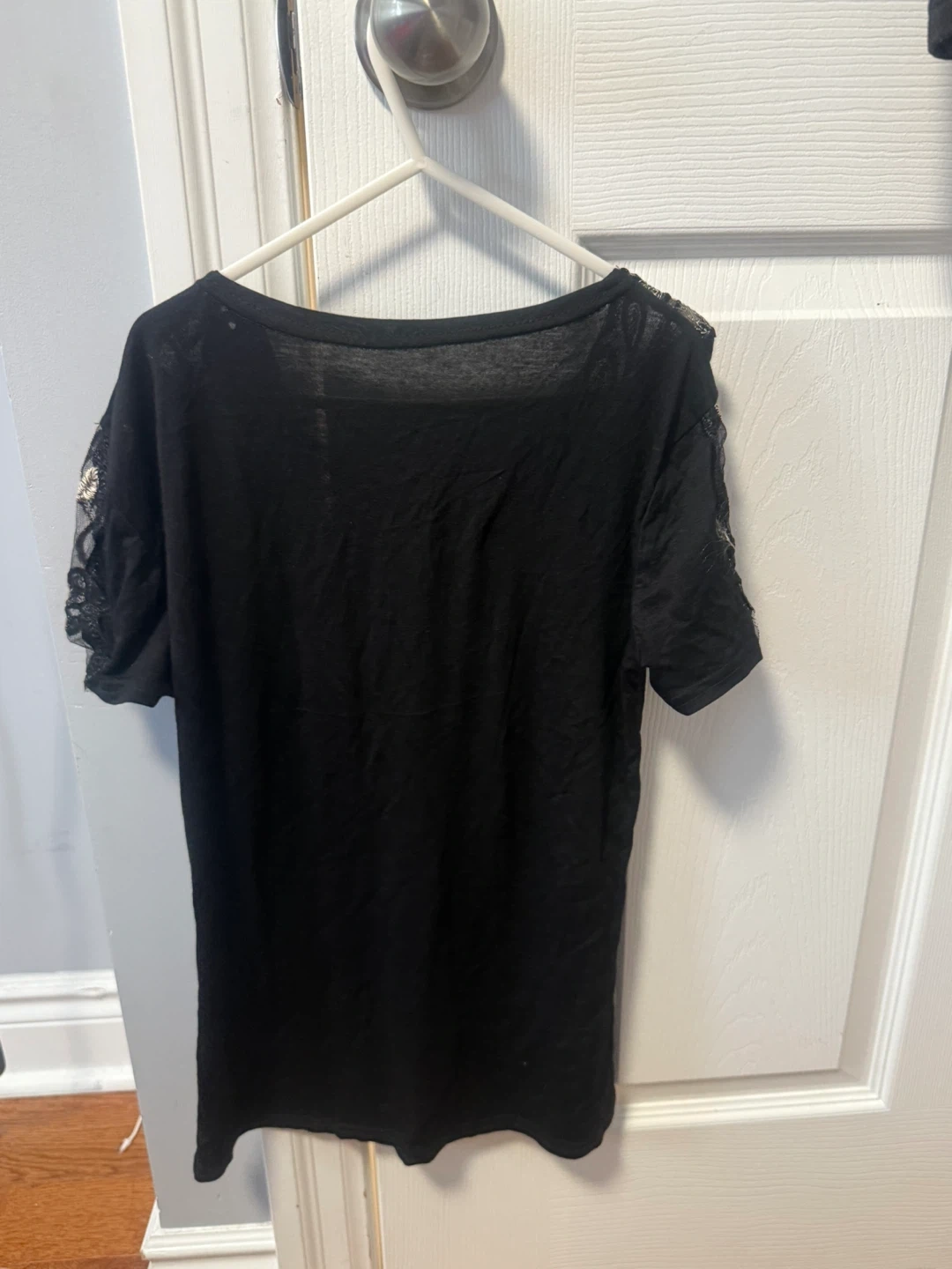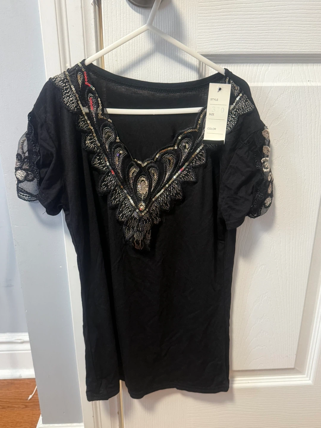 Black short-sleeve V-neck t-shirt with intricate silver and sequin embellishments around the neckline. Lace detailing on the sleeves adds a nice touch. It's a stylish top for a night out!