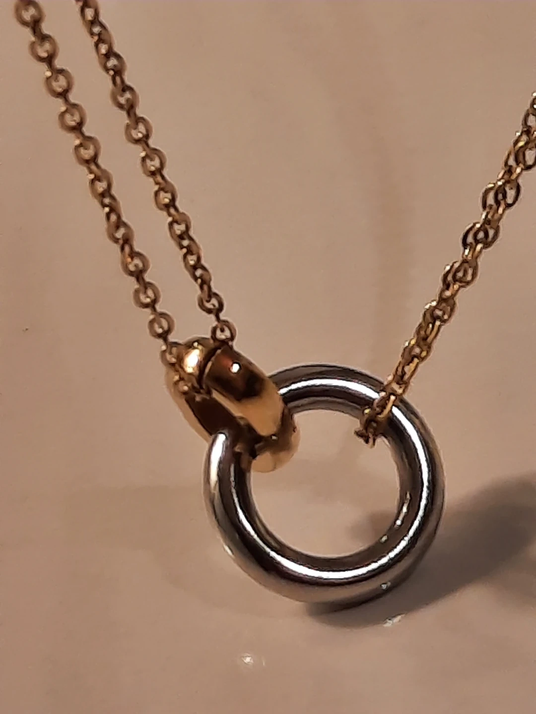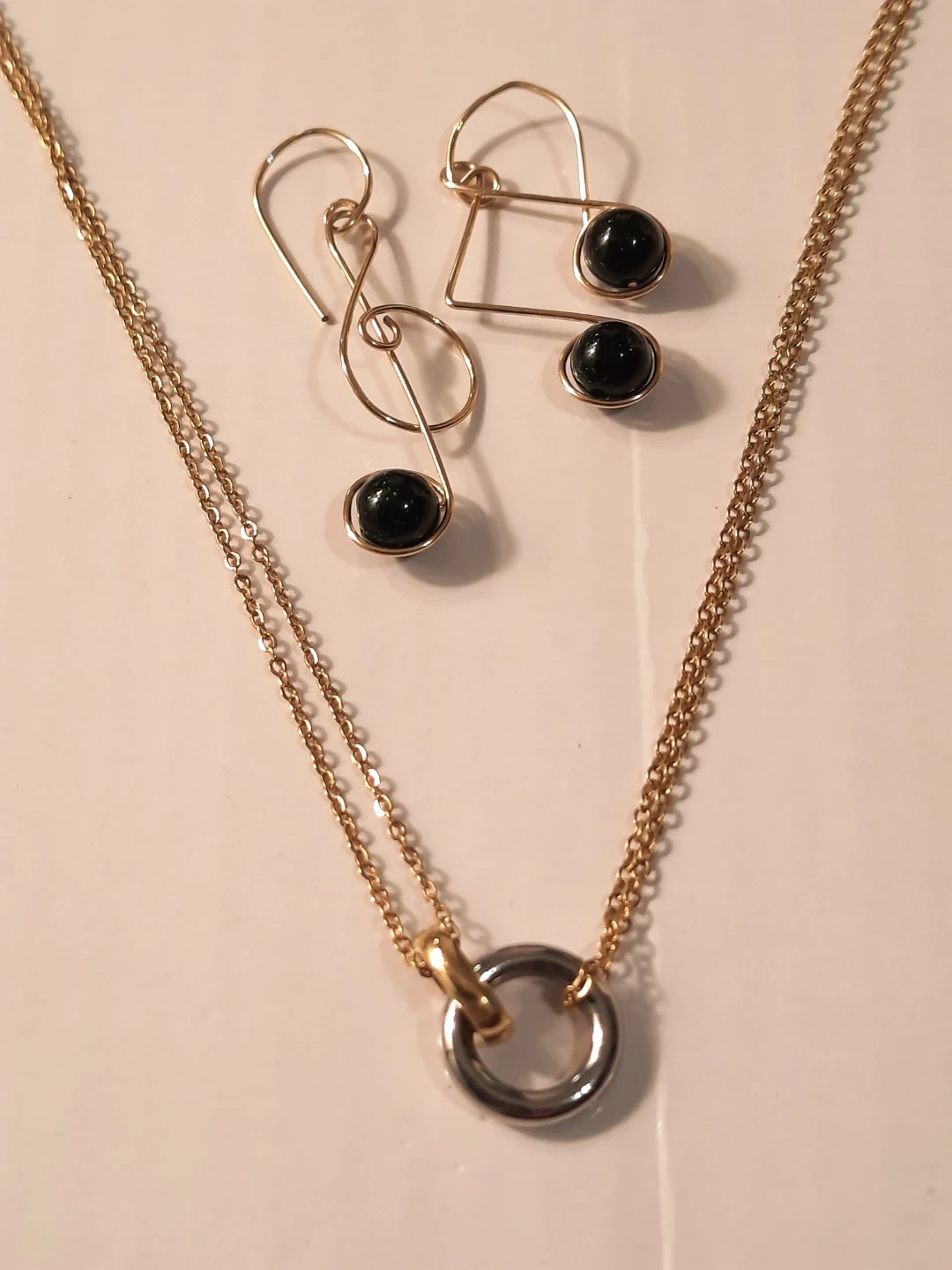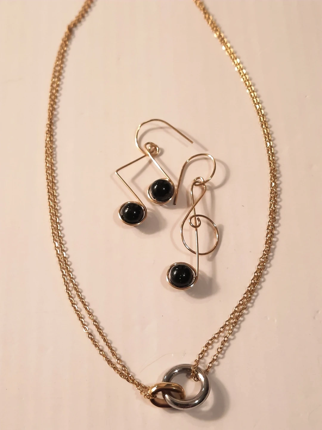 This set includes a gold-tone double-strand necklace stainless steel with interlocking rings and a pair of gold-tone gold filled.eill not tarnish.ling life.earrings shaped like music notes, each adorned with a black bead. The necklace chain measures approximately 20 inches.