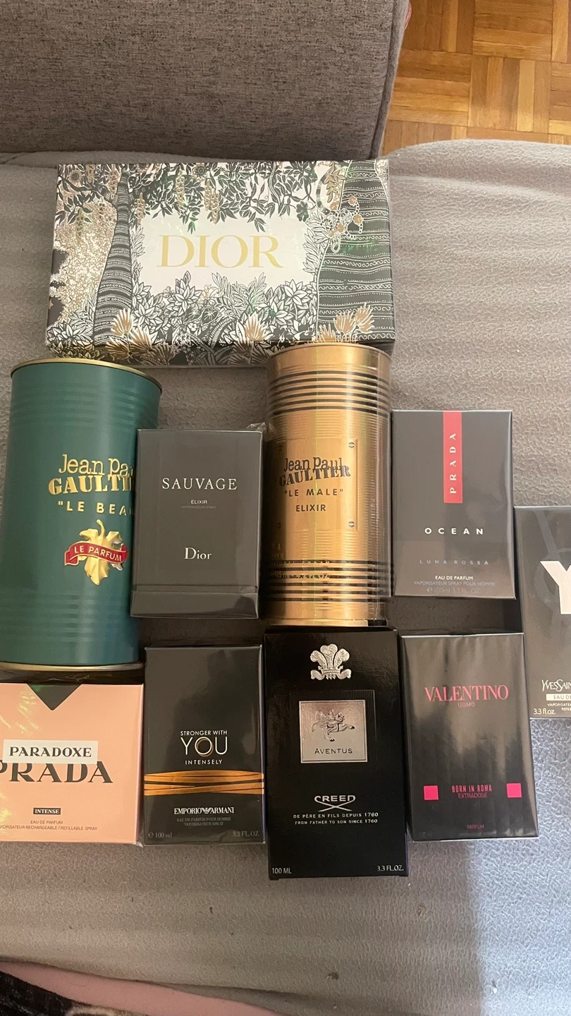 This lot includes various designer colognes such as Dior Sauvage Elixir, Jean Paul Gaultier Le Male Elixir, Prada Ocean Luna Rossa, and Emporio Armani Stronger With You Intensely. Also features Creed Aventus and Valentino Uomo Born in Roma Extradose. Many bottles are 100ml or 3.3 fl.oz. This is a great way to try out several popular scents!