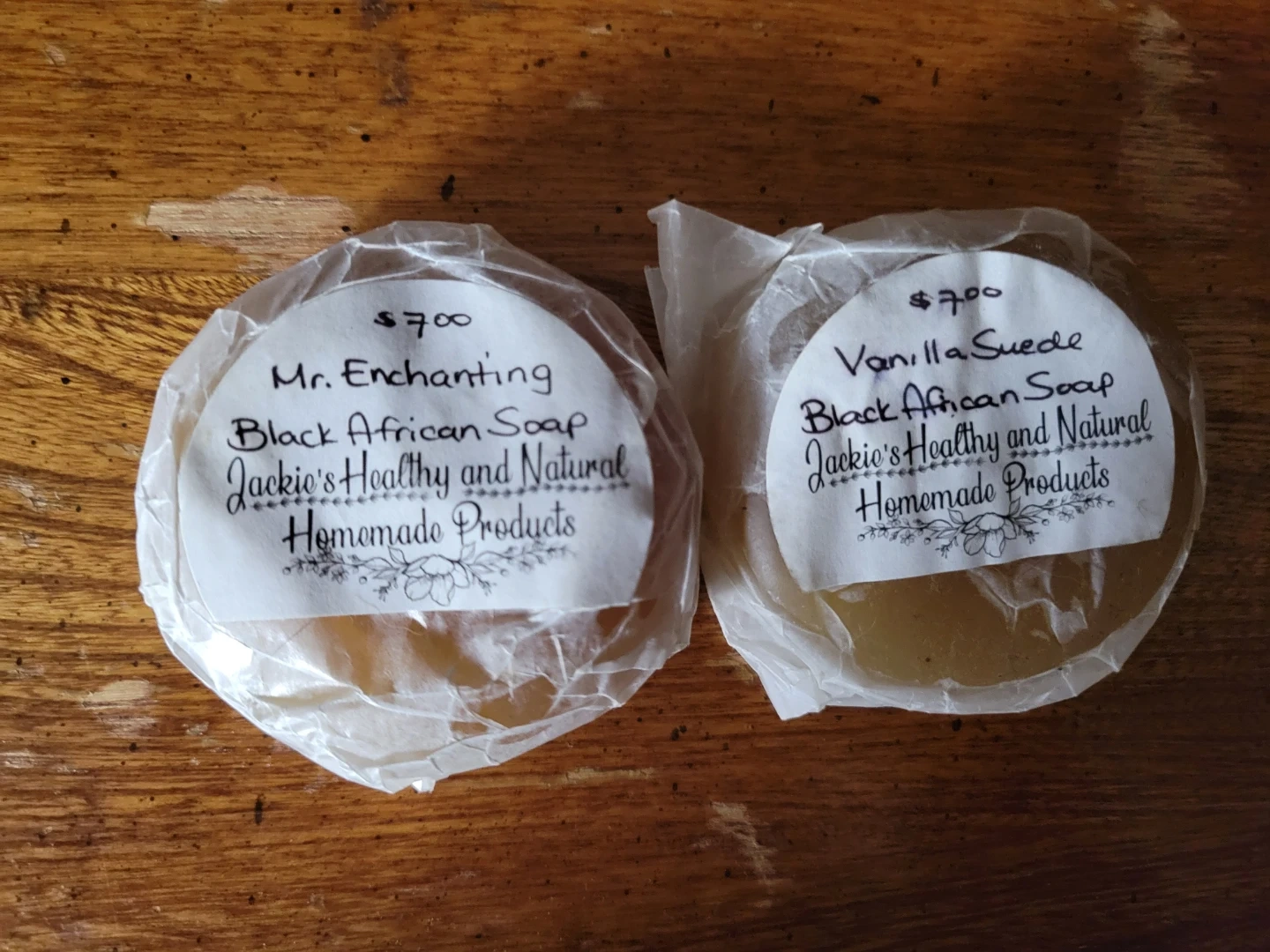 Two bars of Jackie's Healthy and Natural Black African Soap. One is "Mr. Enchanting" and the other is "Vanilla Suede". Handmade products. Perfect for everyday use!