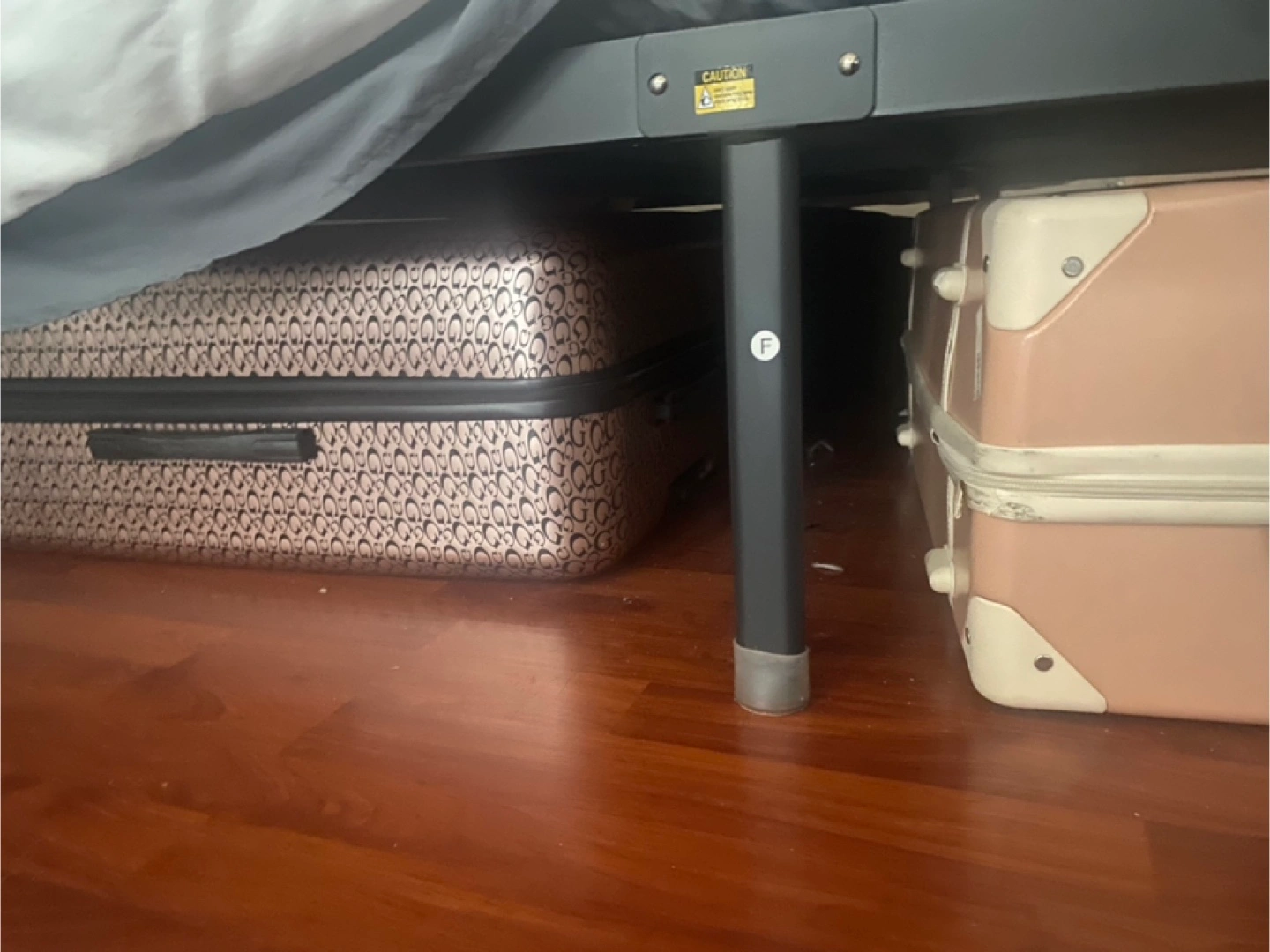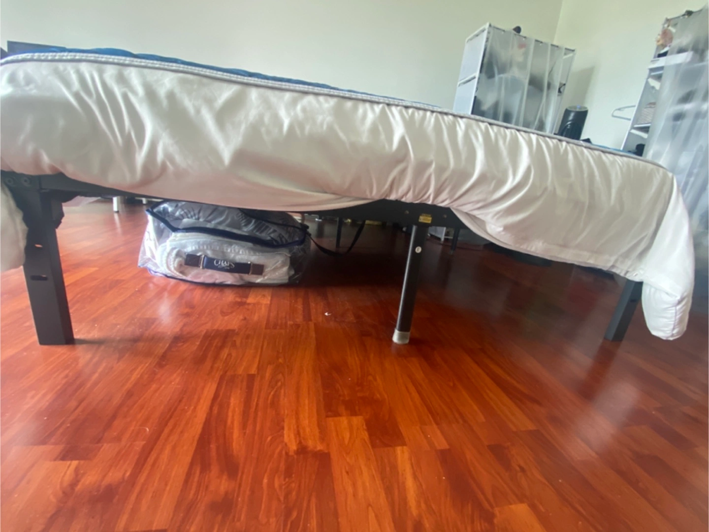 A black, metal bed frame. Designed for a queen size mattress. Great for those who need additional storage space. Place this in your room for a peaceful sleep every night. I could have it partially disassembled to easier pick up.
