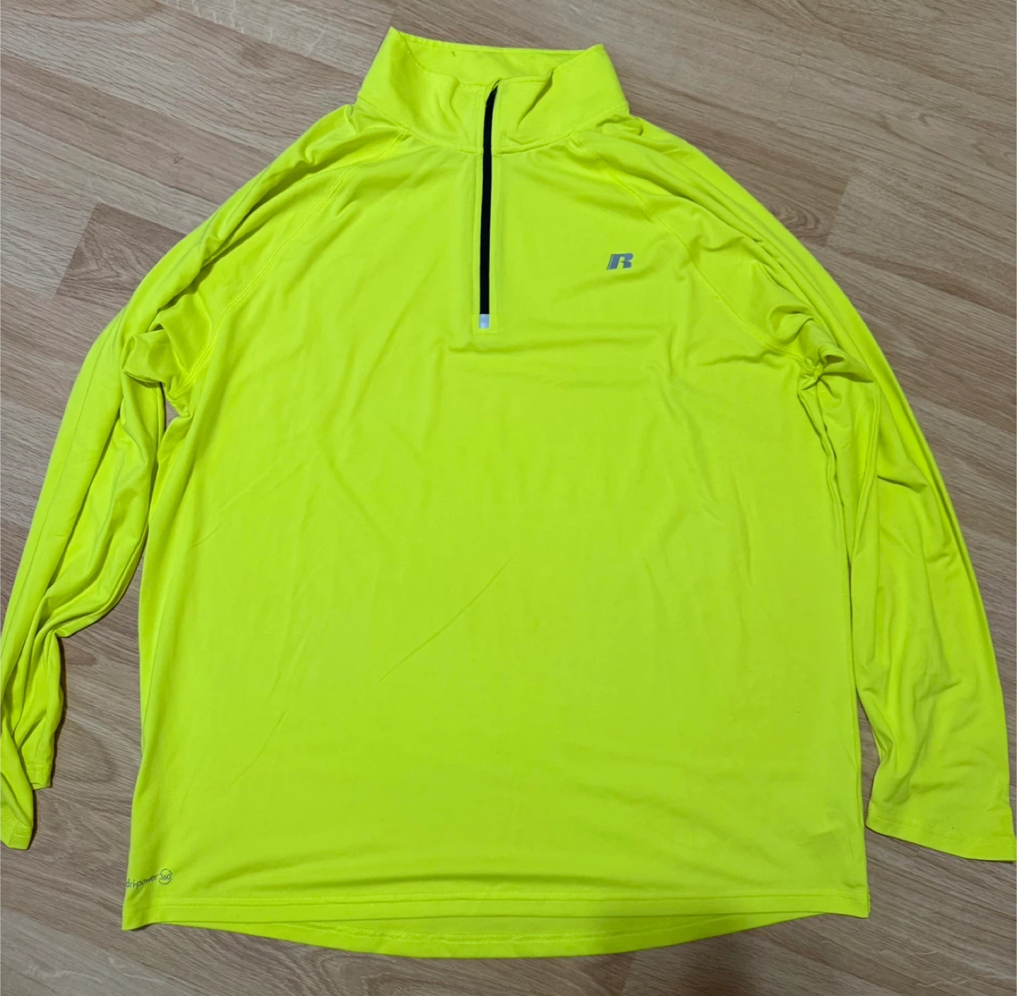 This is a Russell Athletic long-sleeve quarter zip pullover shirt. It's a bright neon yellow color and has a "dri-power 360" moisture-wicking fabric. The size is XL.