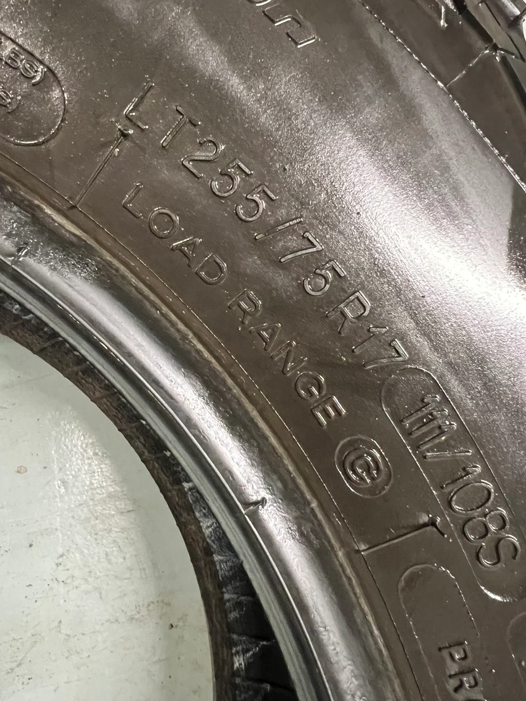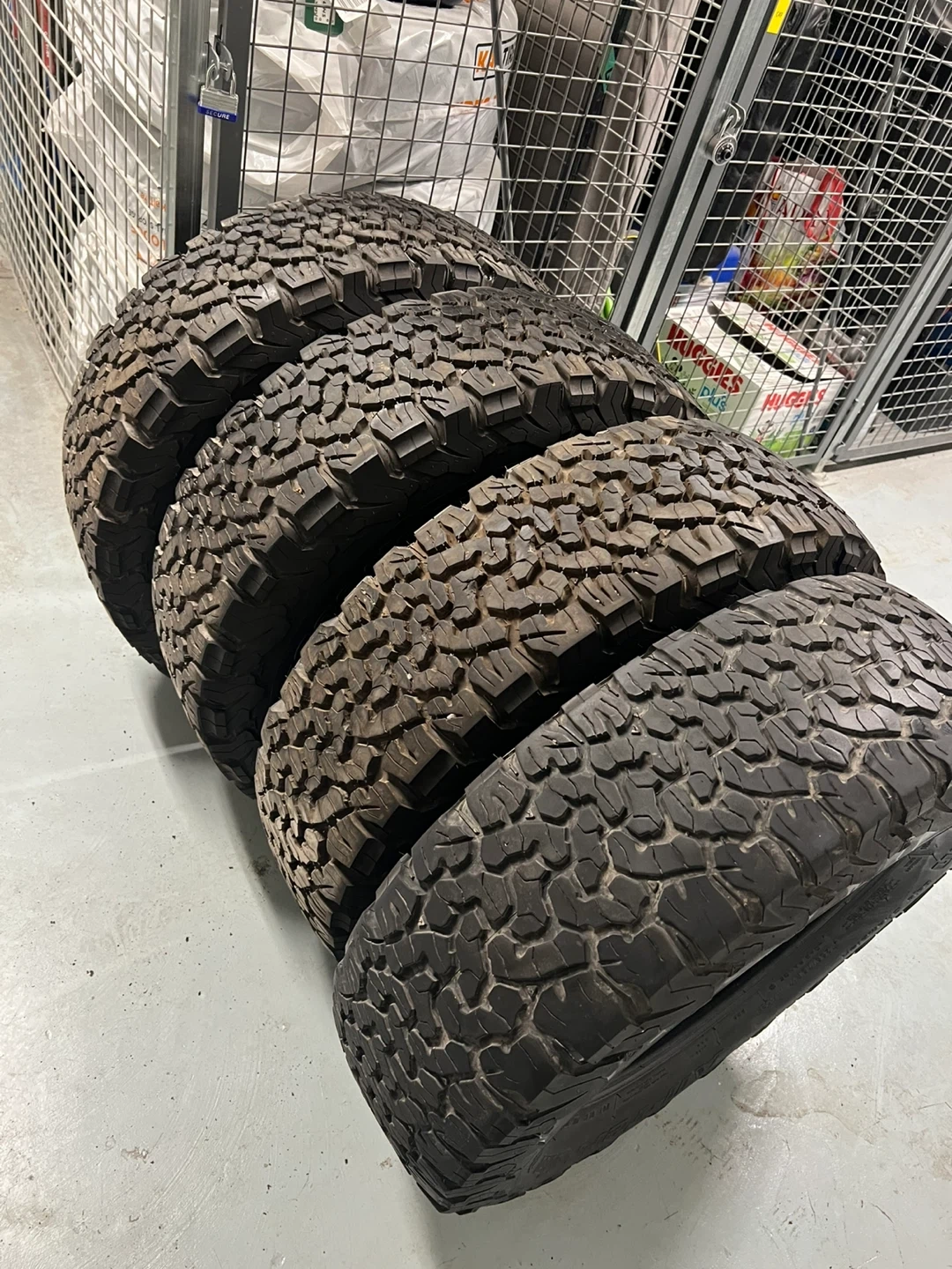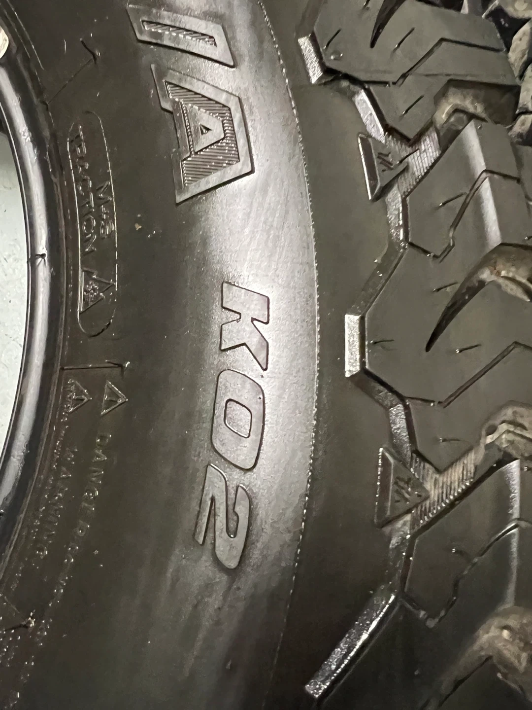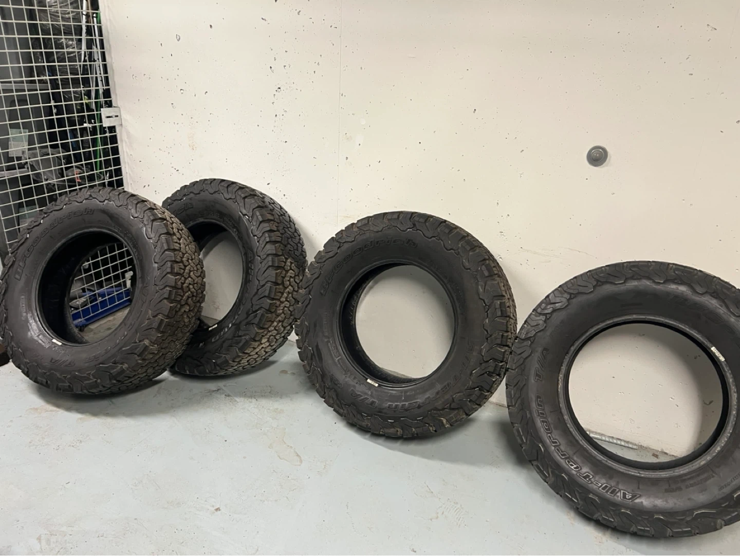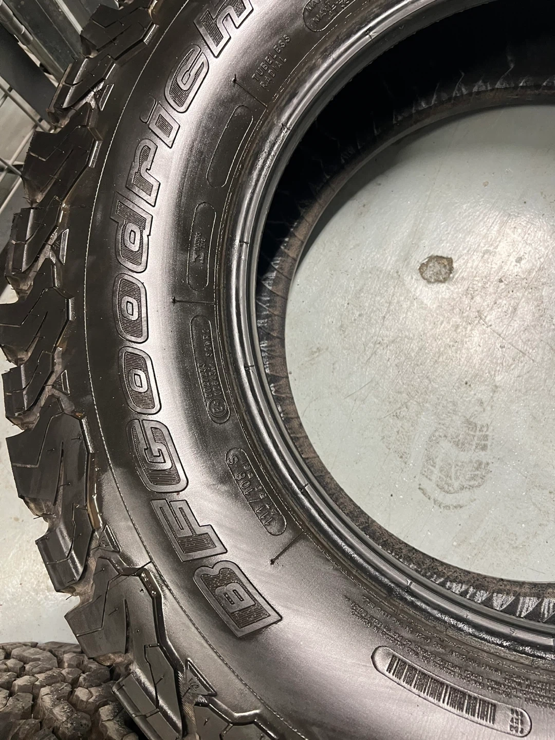 Set of four BFGoodrich All-Terrain T/A KO2 tires. Load range C, size LT255/75R17. M+S rated for mud and snow traction. Tread depth measured at 11/32nds to 14/32nds.
