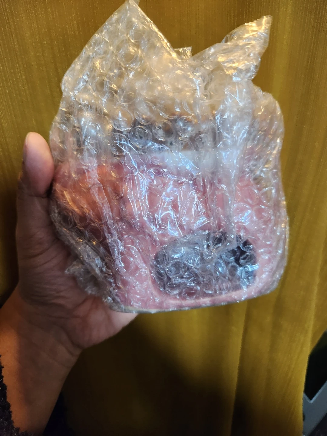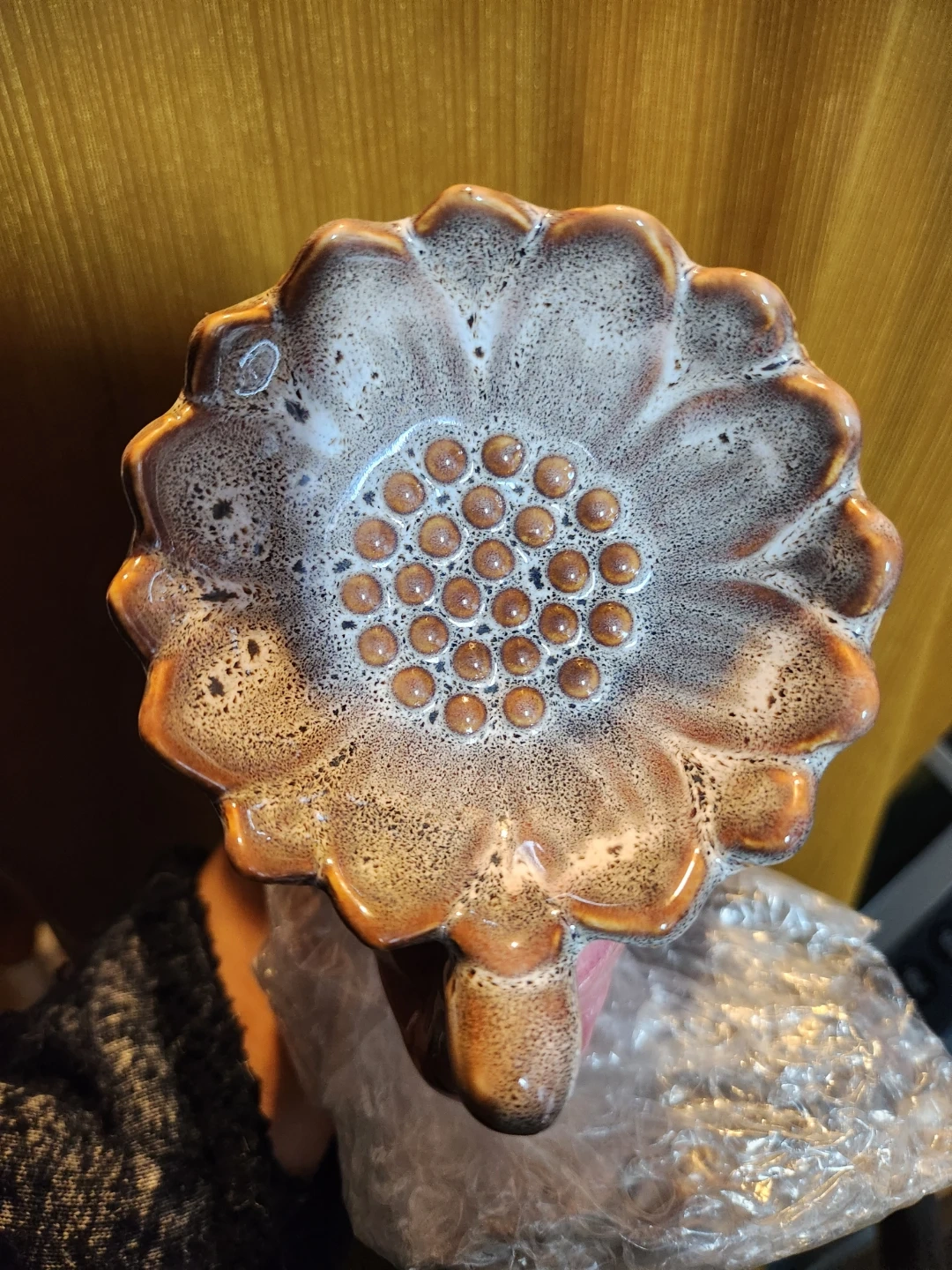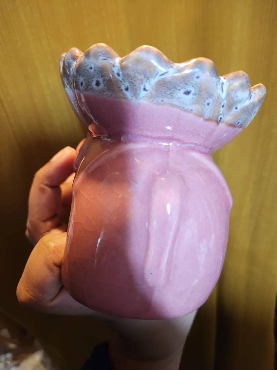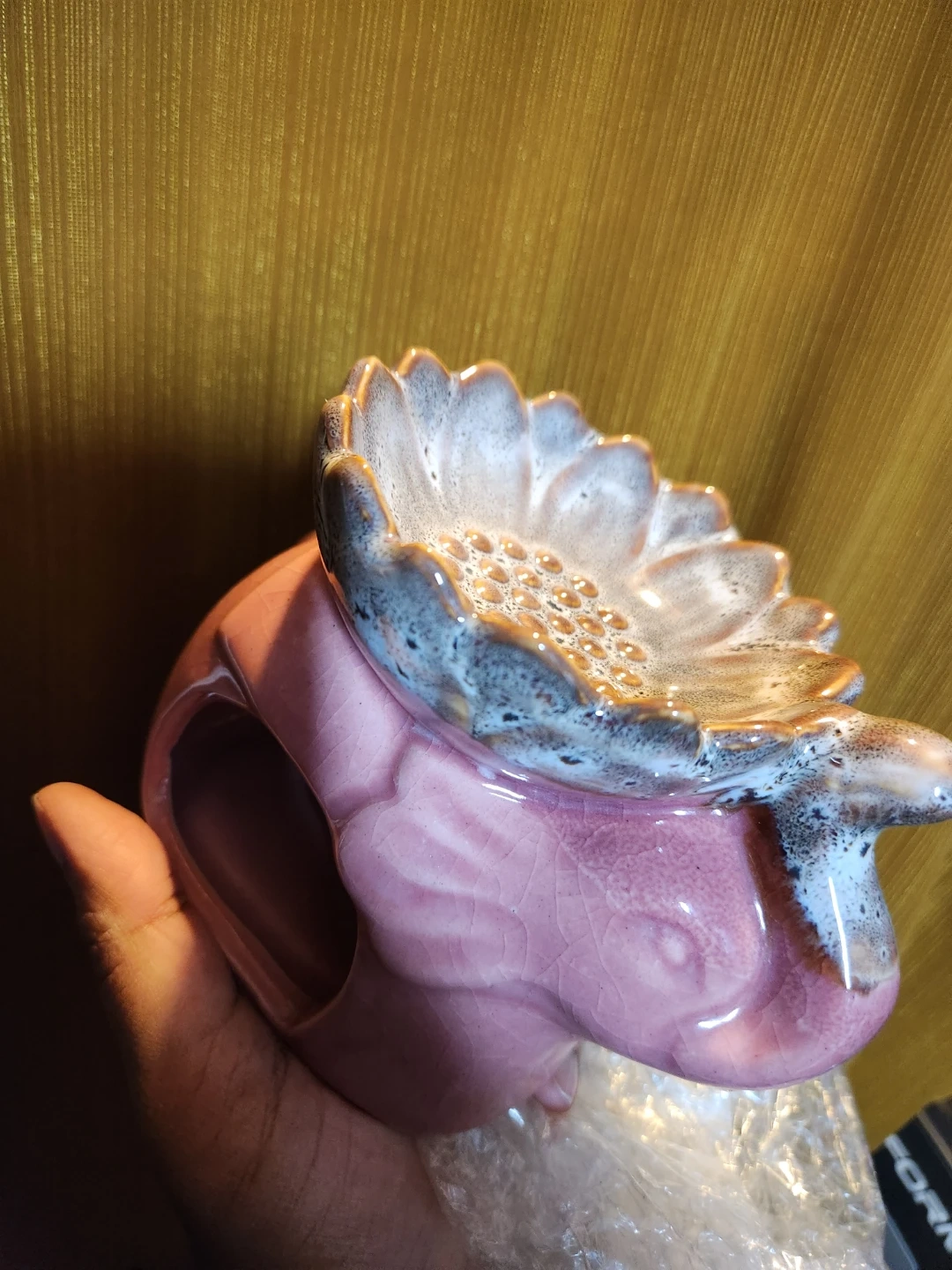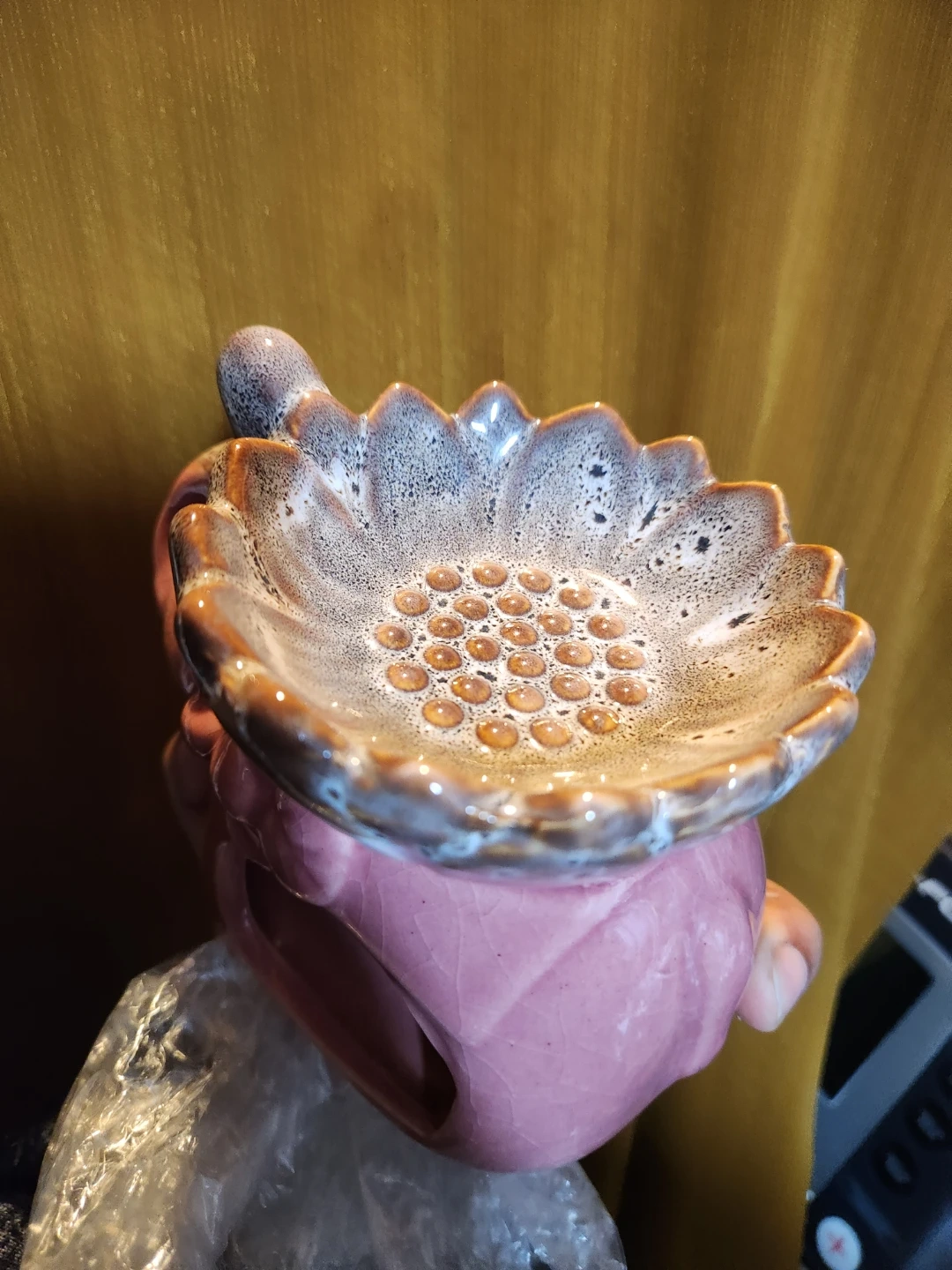 This cute pink ceramic elephant oil burner is shaped like an elephant with a floral dish on top. It's perfect for diffusing essential oils or for use as a wax melt warmer. The dish has a textured surface with many small indentations. It's a fun piece for home decor!