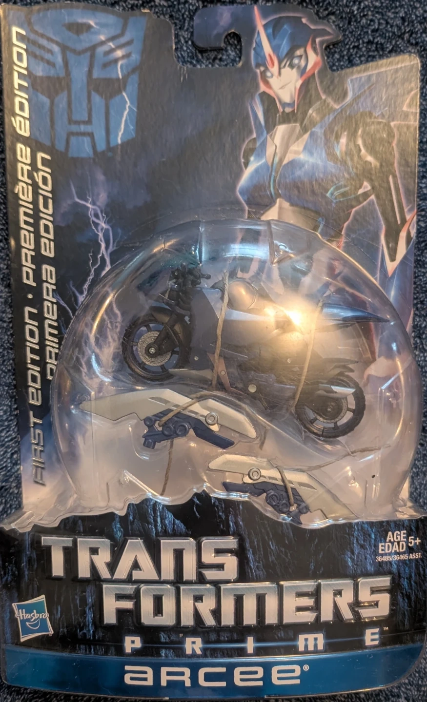 This deluxe size Transformers Prime, first edition, Arcee action figure transforms from a sports motorcycle to robot, and back again.