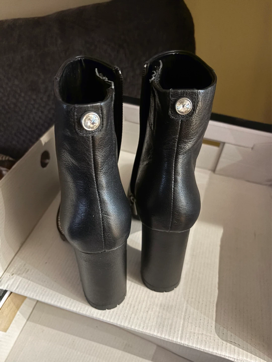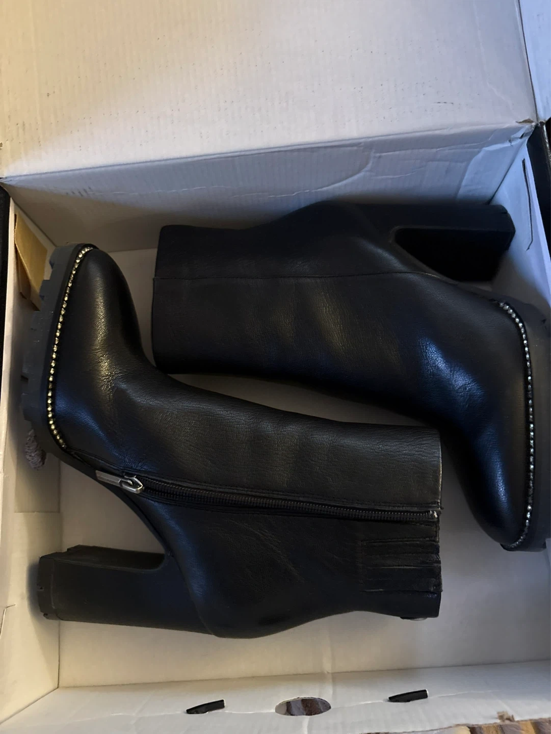 These Karl Lagerfeld Paris boots are made from black leather. They feature a lug-sole and a side zipper closure. Comes with the original box.