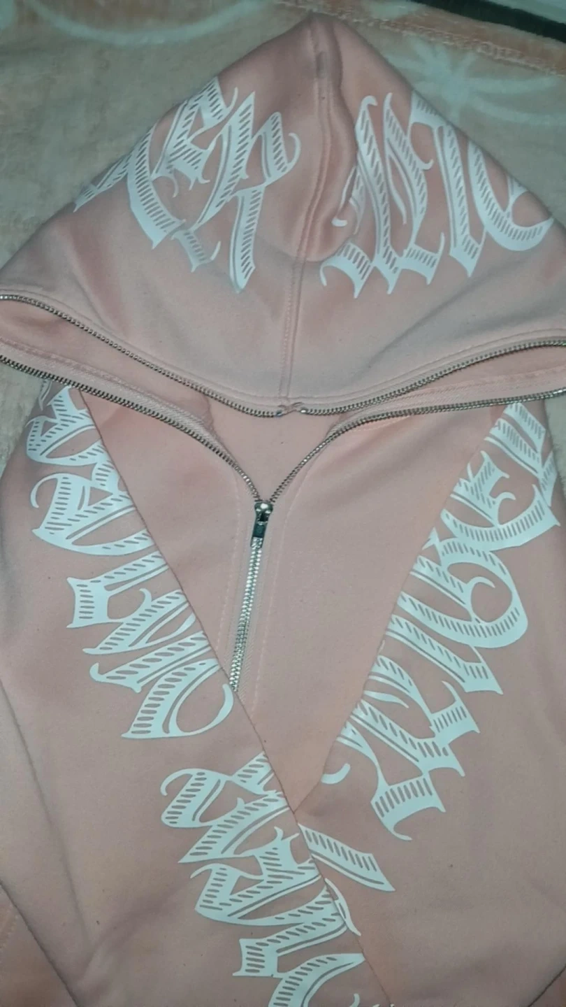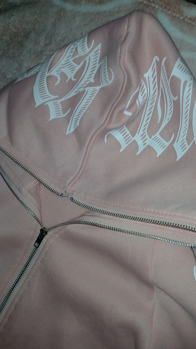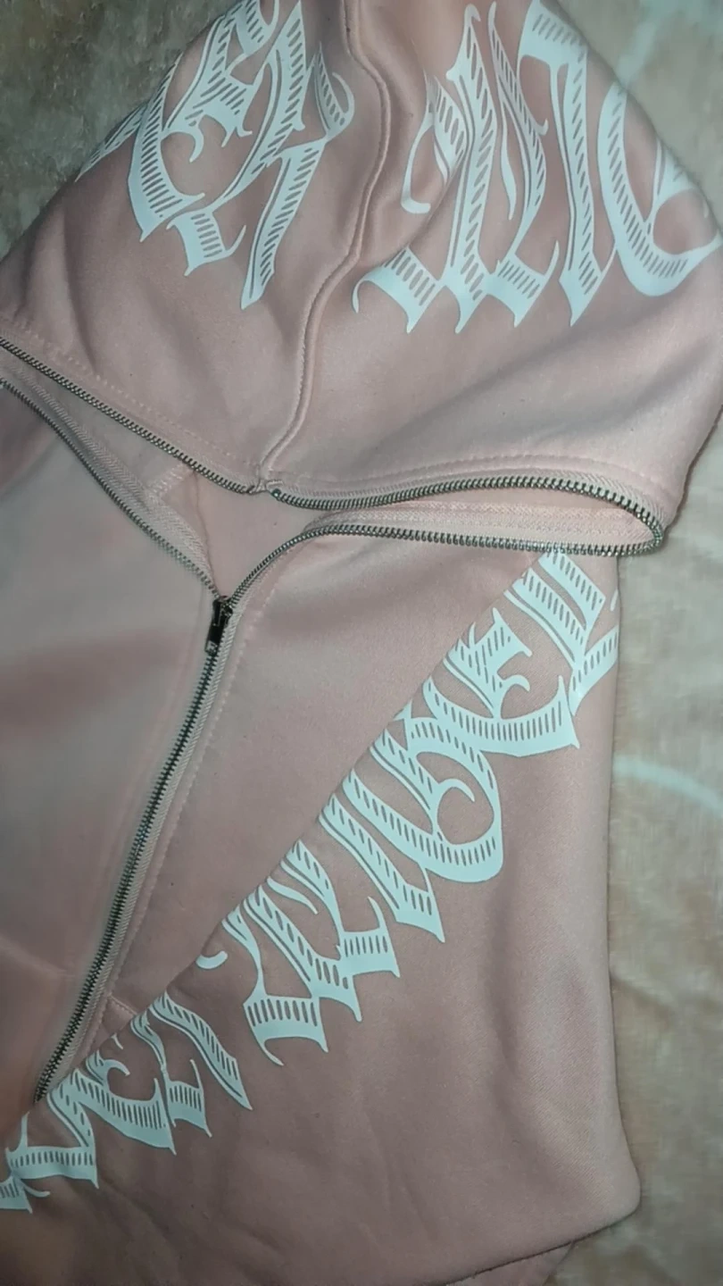 This zip-up hoodie is a soft pink with a bold white graphic design on the hood and sleeves. It features a full-zip front and a comfortable hood. It's made from a soft fabric blend, perfect for casual wear.