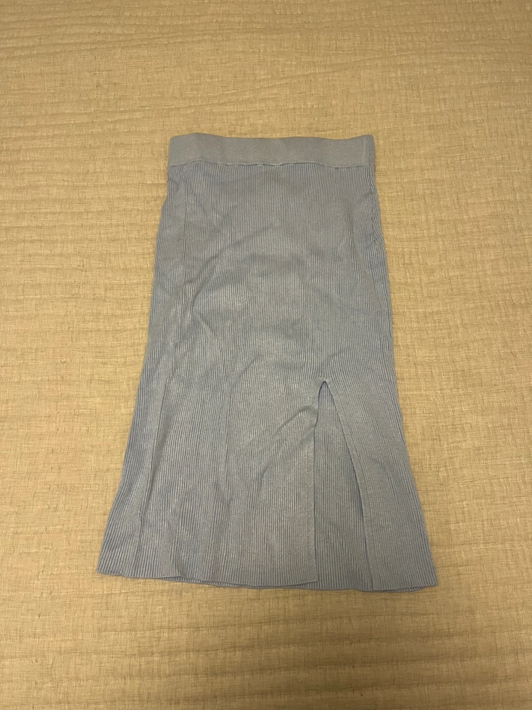 Beautiful light blue ribbed knit midi skirt. Features a flattering side slit. Size small. Excellent condition.