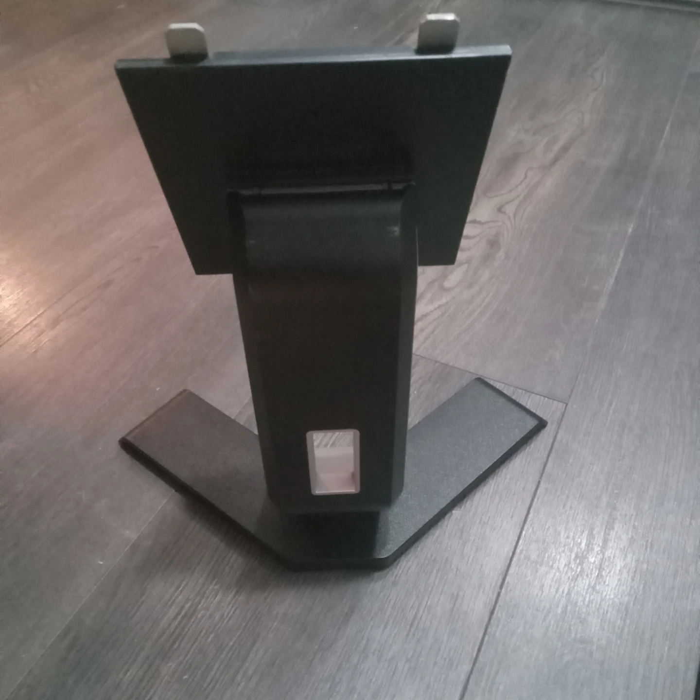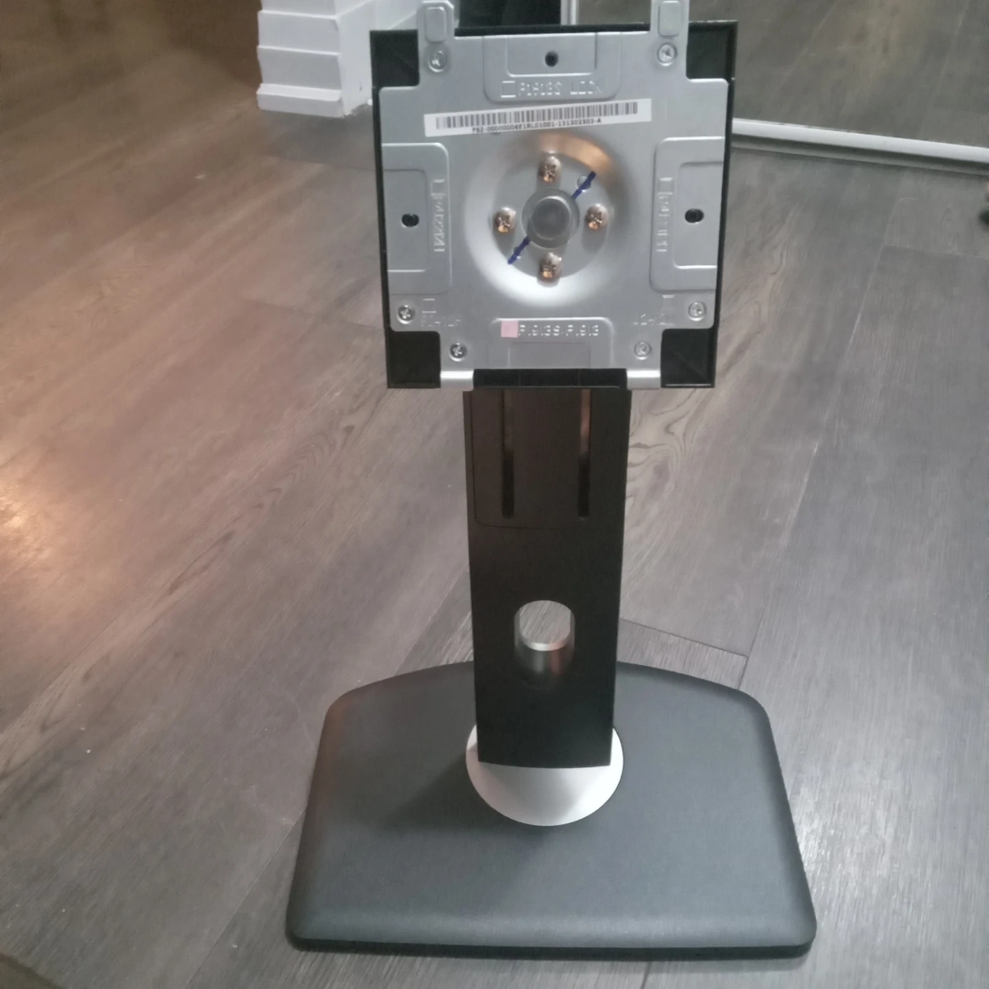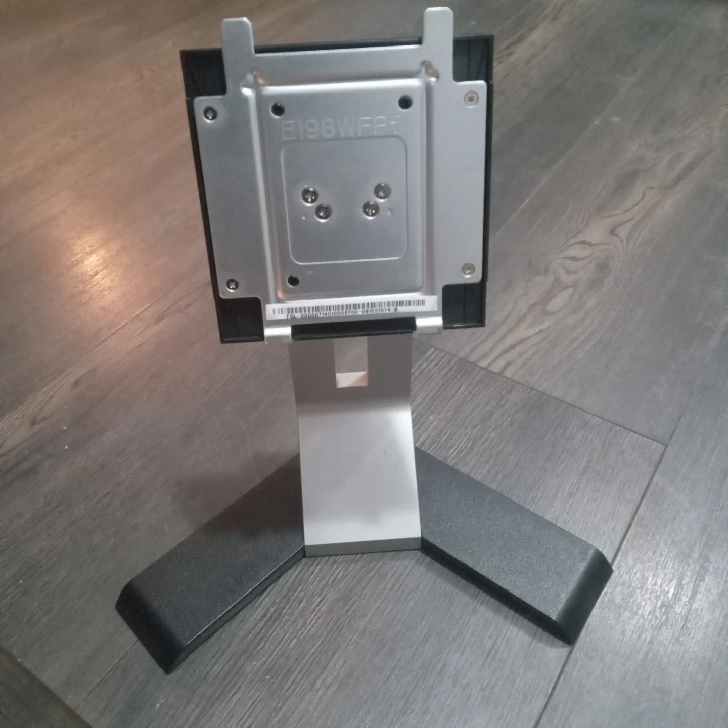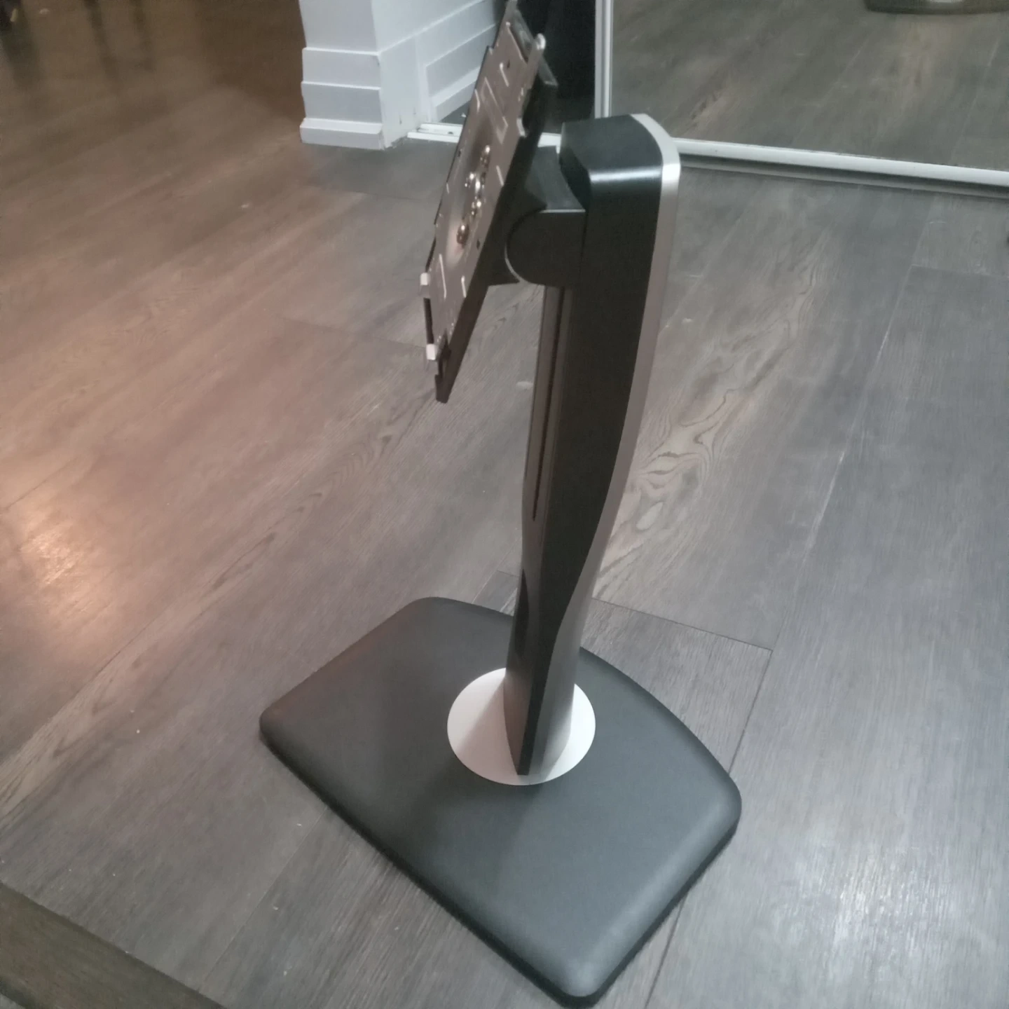 Dell monitor stand with a black and silver finish. It's designed to hold a monitor and includes a sturdy base with a movable arm. This stand is perfect for setting up a desktop workstation.