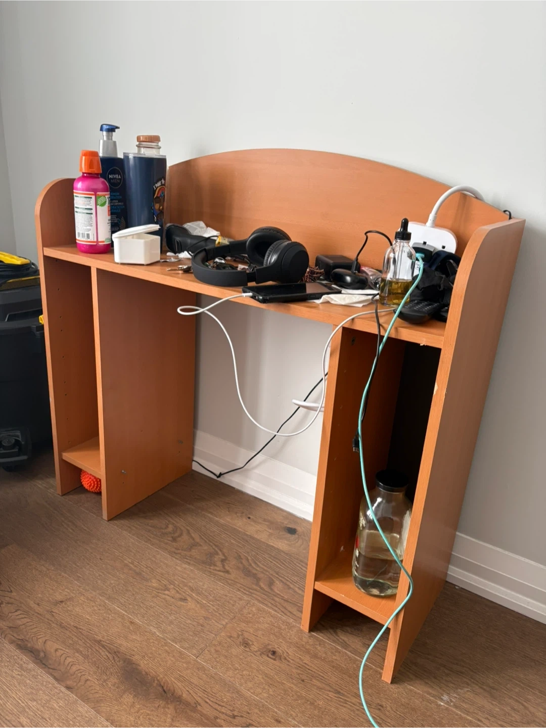 This is a compact wooden desk with two open shelving compartments. It's perfect for a small workspace or gaming setup. The desk has a curved top edge and a simple, functional design. Moving sale must pickup first come first serve. First come first served , make me a offer ready to move