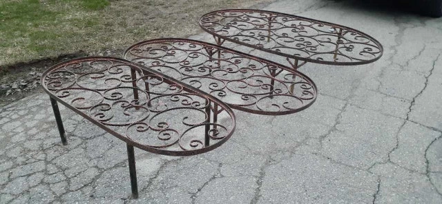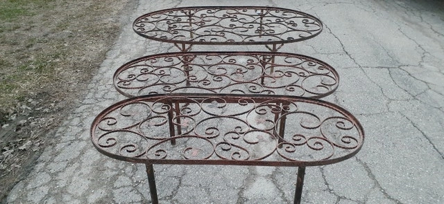 Selling a matching set of three (3) ornate wrought iron stands. These feature beautiful, heavy-duty scrollwork and a solid metal frame. I do not have the glass for them, making them the perfect blank canvas for your next DIY project! Potential Uses: -Garden Decor: These are stunning as-is in a garden to hold large potted ferns or heavy planters. -Home Decor: Use them as low-profile console bases or decorative floor accents. -Condition: Solid and sturdy with a natural aged patina. No structural damage. Can be painted or left as-is for a rustic look. -Dimensions: Are in the last photo -Price: $100 for the set of 3 (or $40 each). Location: Beaverton. Cash accepted.