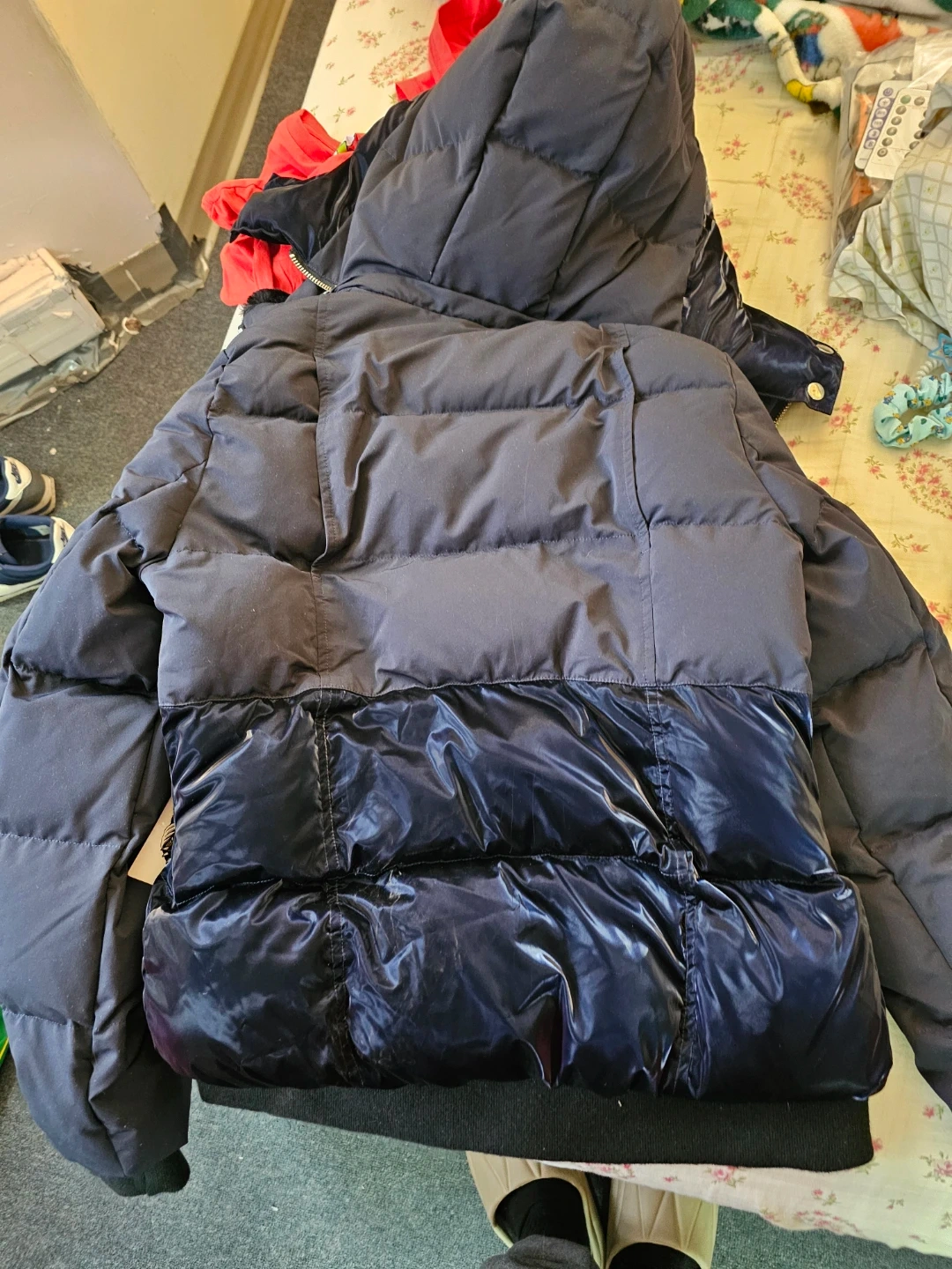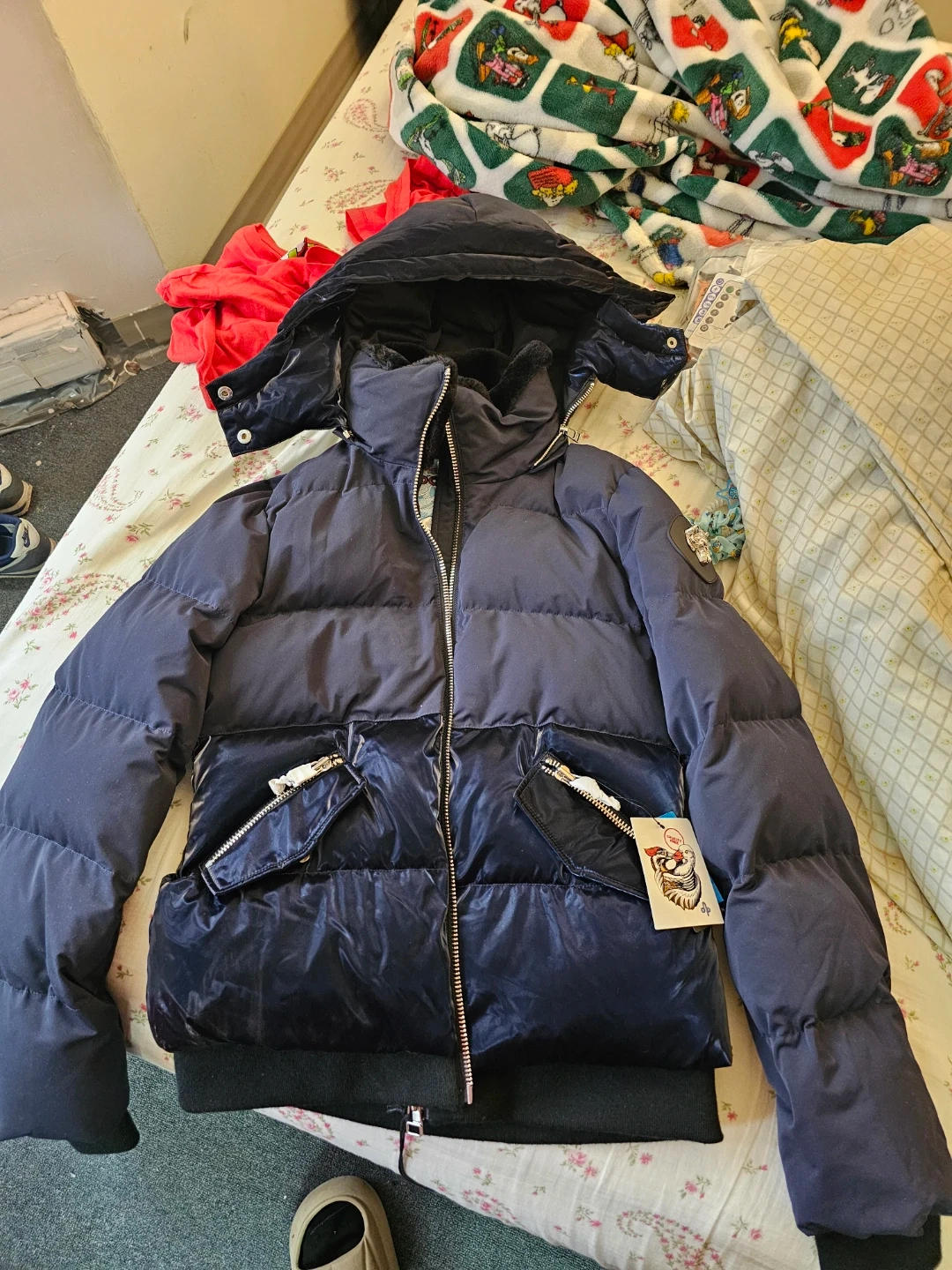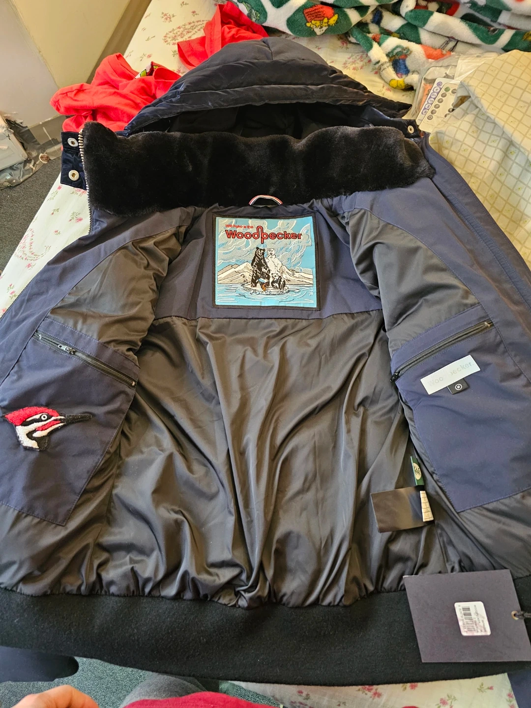 Selling a stylish Woodpecker winter coat in navy. It's in great condition and perfect for staying warm during the cold Canadian winters! This coat features a hood, a front zipper closure, and a unique logo on the sleeve. It’s a beautiful and functional piece!