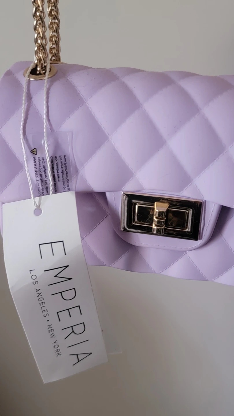 This Emperia handbag is a stylish lavender colour and made from jelly material. It has a quilted design with a gold chain strap and a secure clasp closure. It's perfect for adding a pop of colour to any outfit!