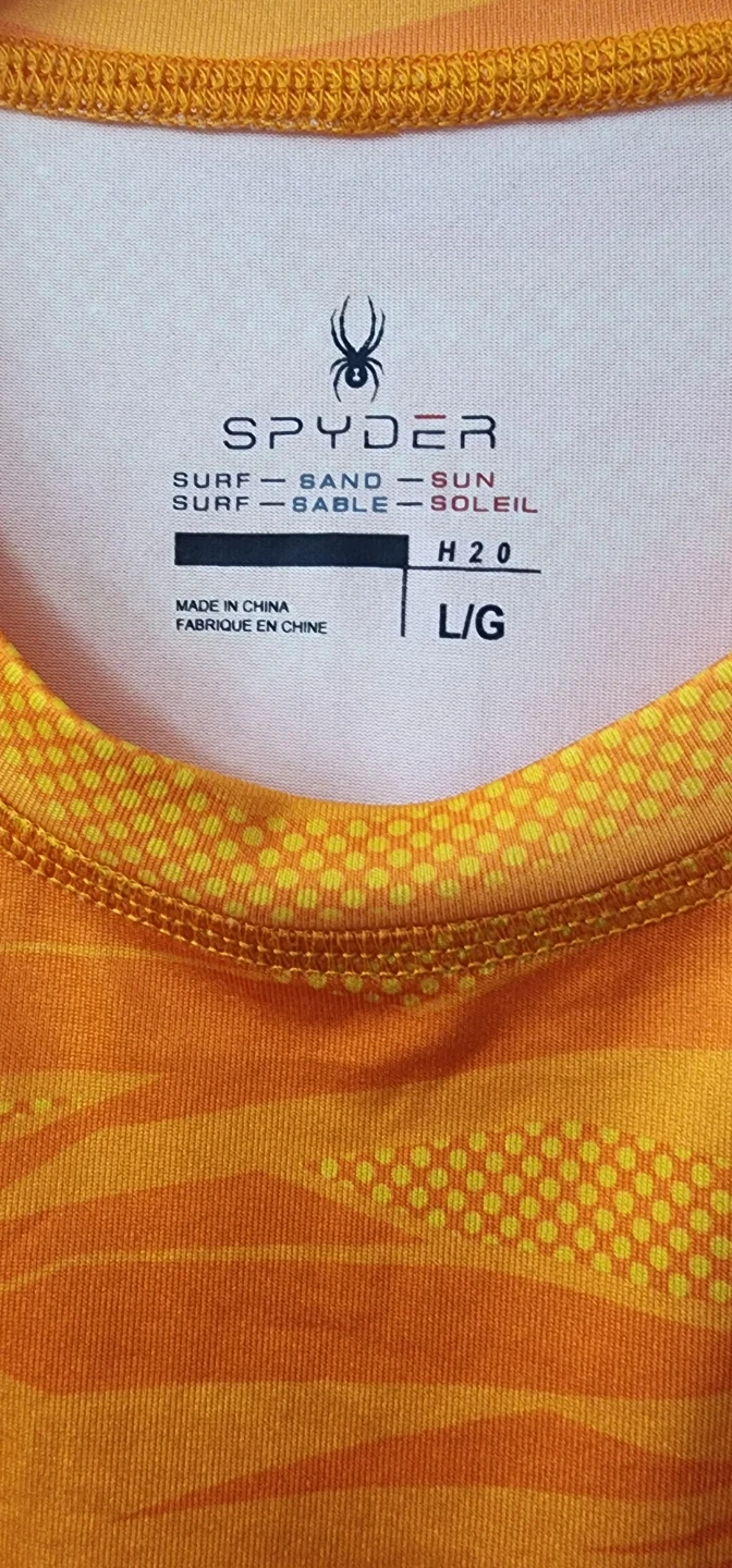 Original Spyder t-shirt and shorts set in orange and navy. Size is L/G. Great for beach days and swimming! Pet free and smoke free home!