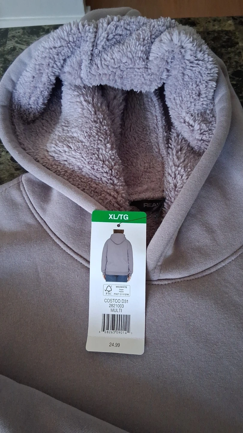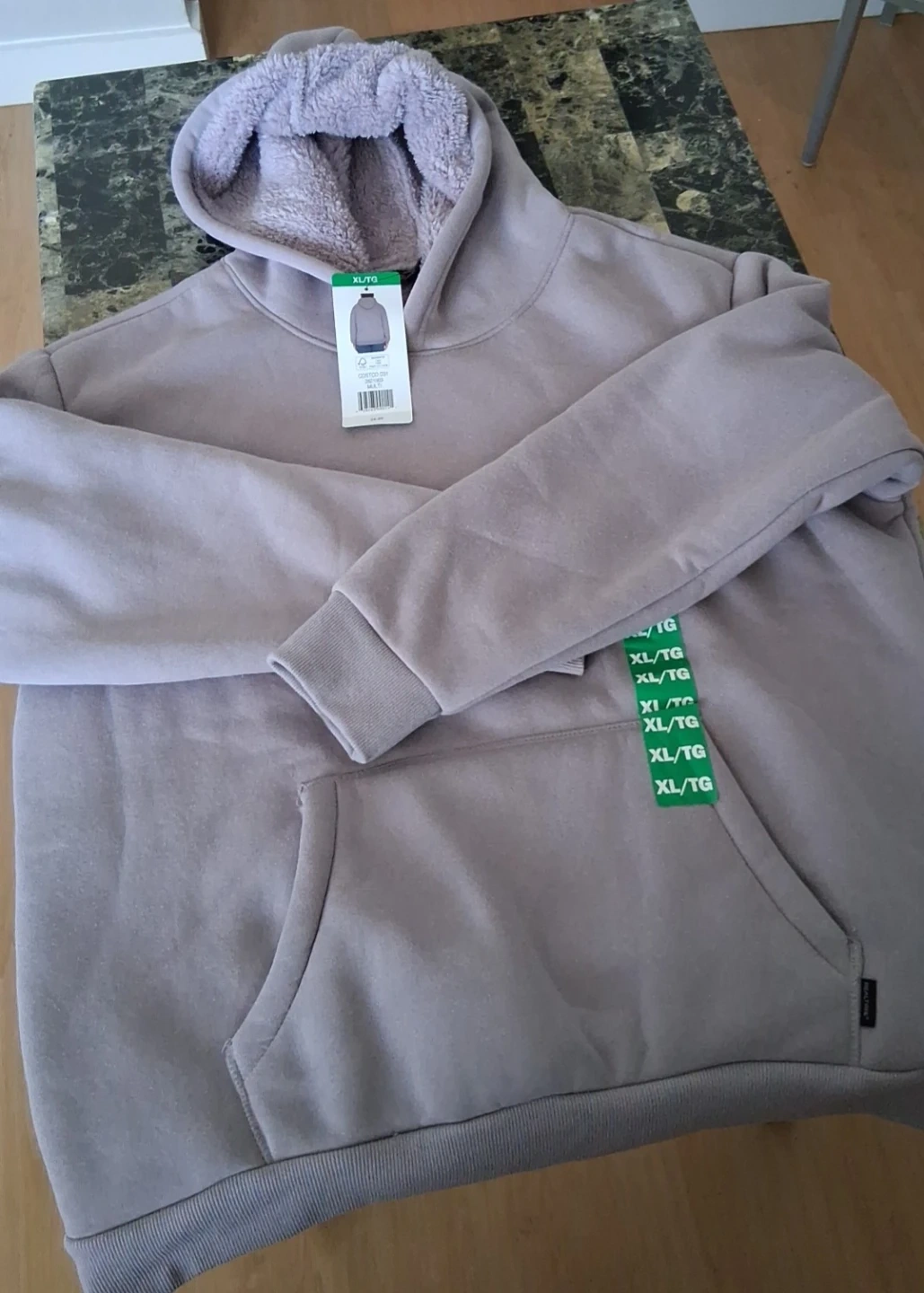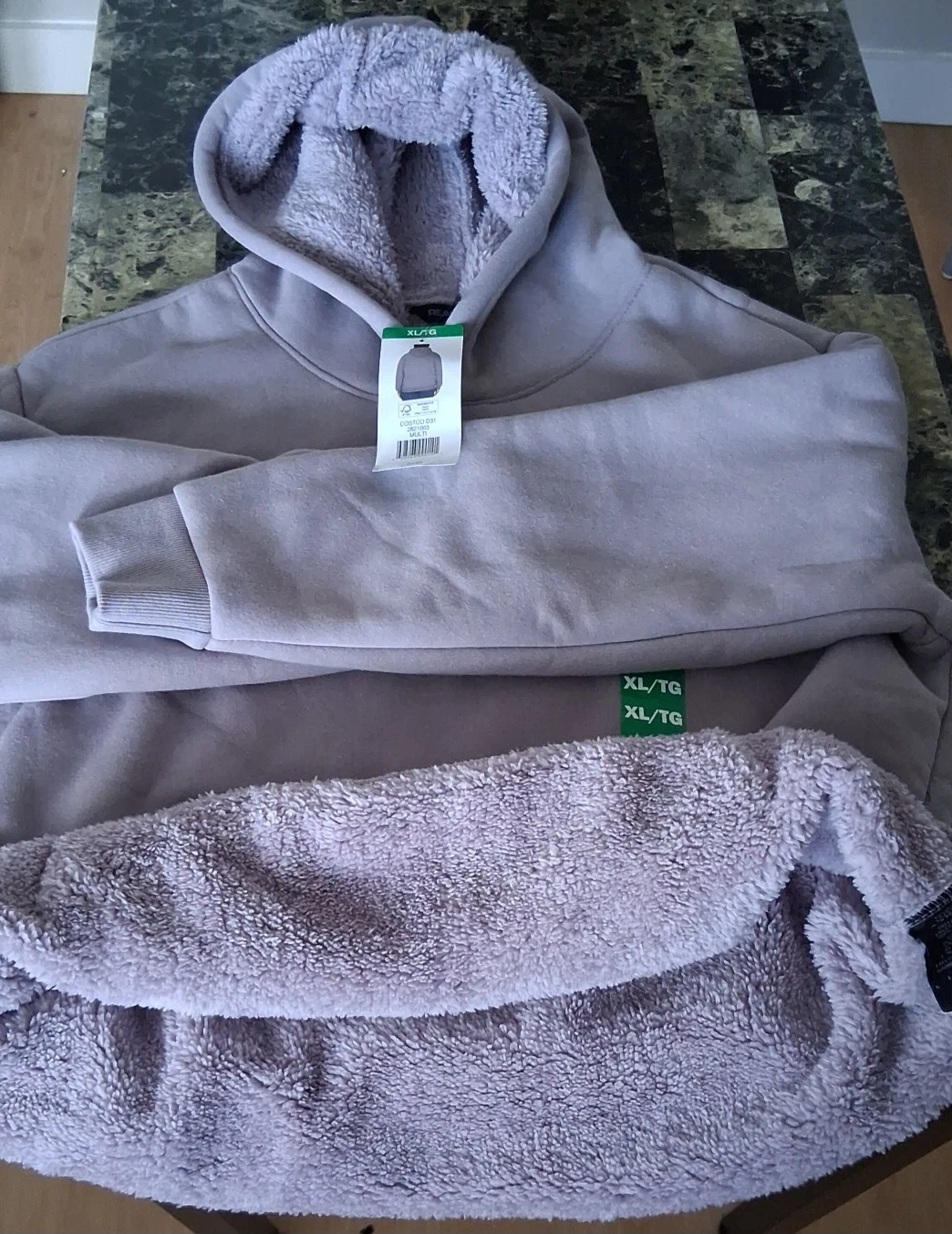 Purple hoodie in size XL/TG. It features a soft, fuzzy interior lining for extra warmth. The hoodie is a light purple/grey colour.