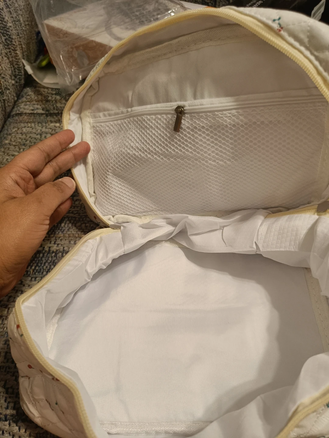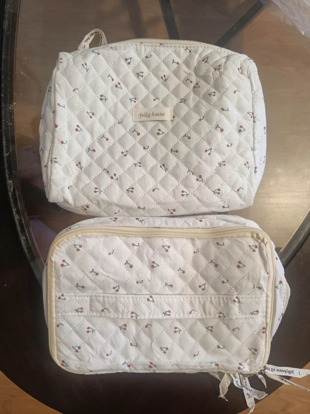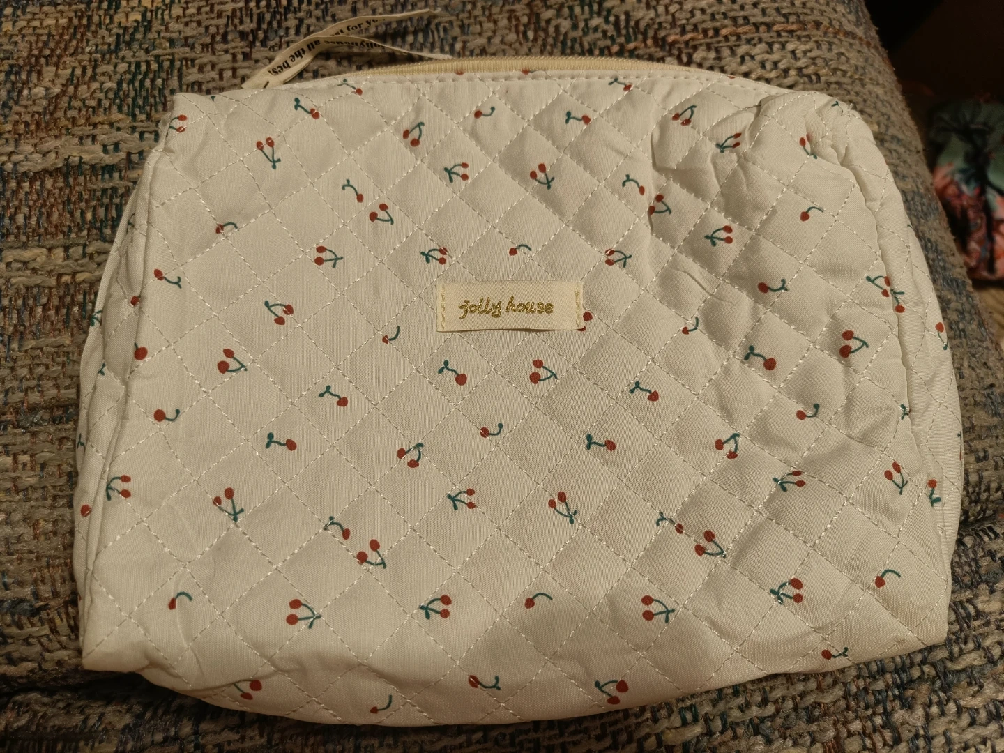 This is a quilted cosmetic bag from Jolly House featuring a cute cherry pattern. It has multiple compartments inside for organization. It's perfect for storing makeup and toiletries while travelling.