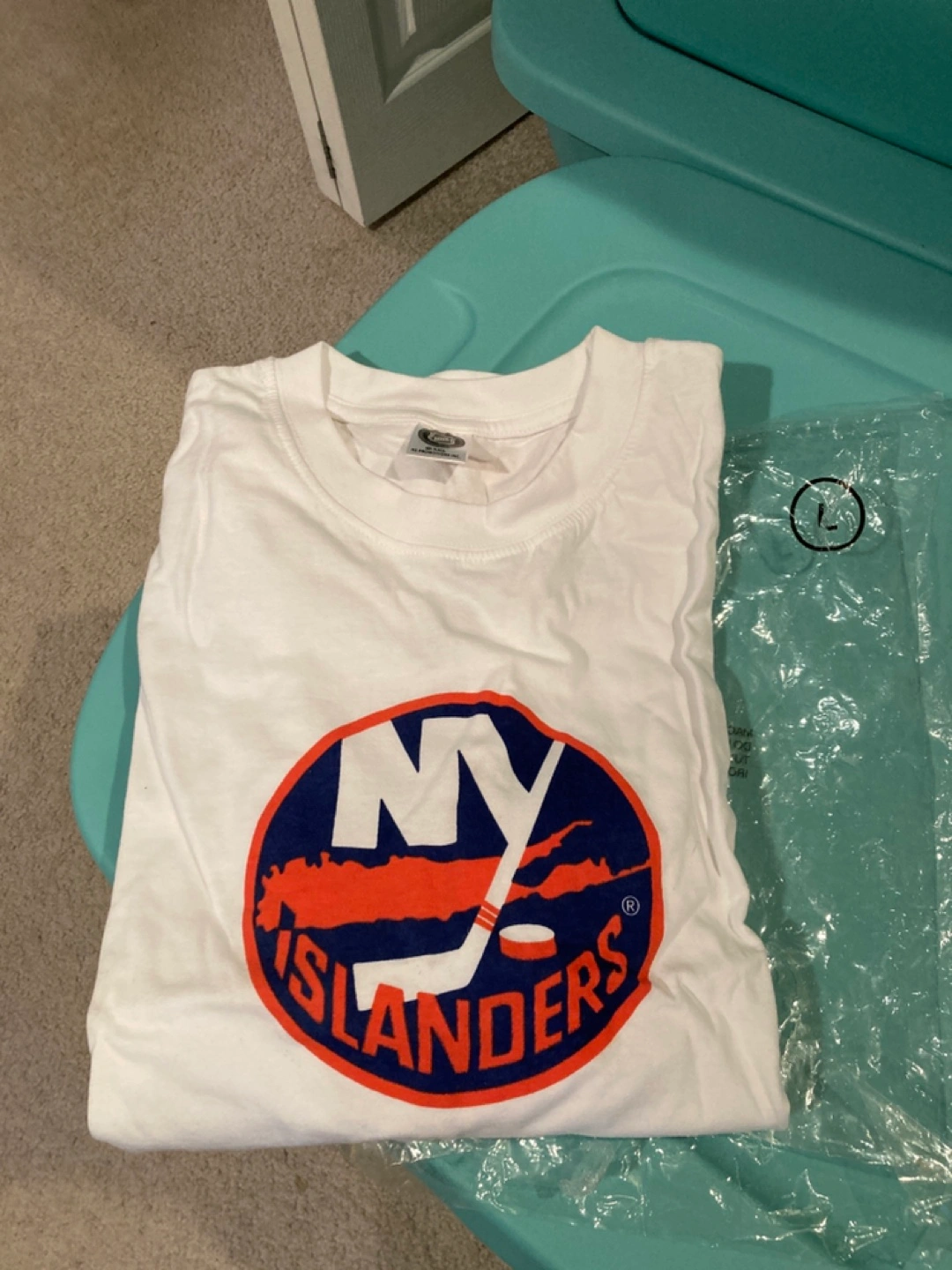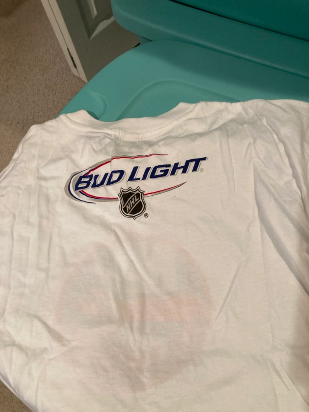 White men's t-shirt. Features the New York Islanders logo on the front and Bud Light NHL logo on the back. Adult size. It says size large but it’s quite small.