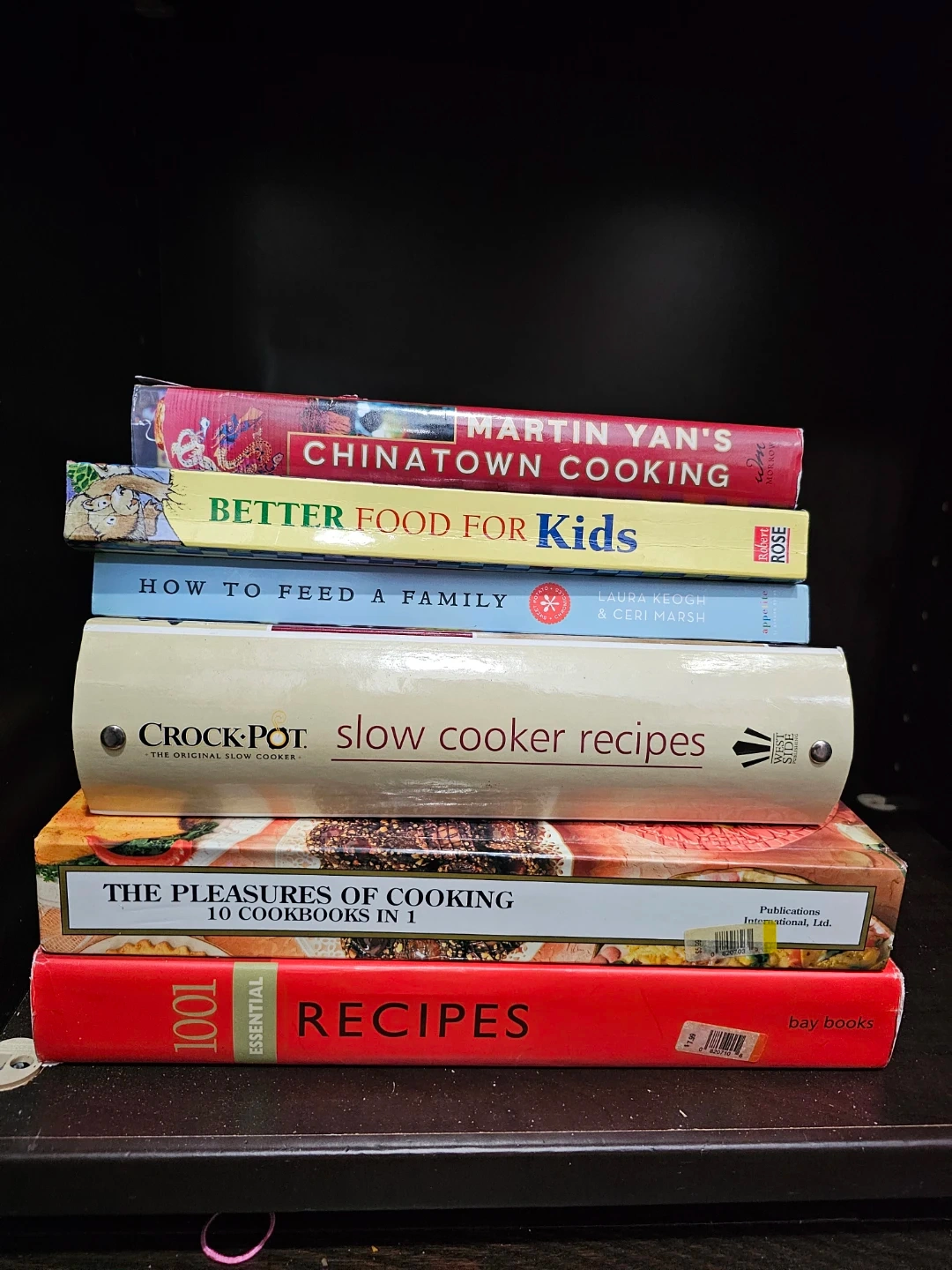 This collection includes 5 cookbooks covering a range of culinary topics. There's Martin Yan's Chinatown Cooking, Better Food for Kids, How to Feed a Family, Crock-Pot slow cooker recipes, and The Pleasures of Cooking (10 Cookbooks in 1). They offer diverse recipes for different needs and occasions.
