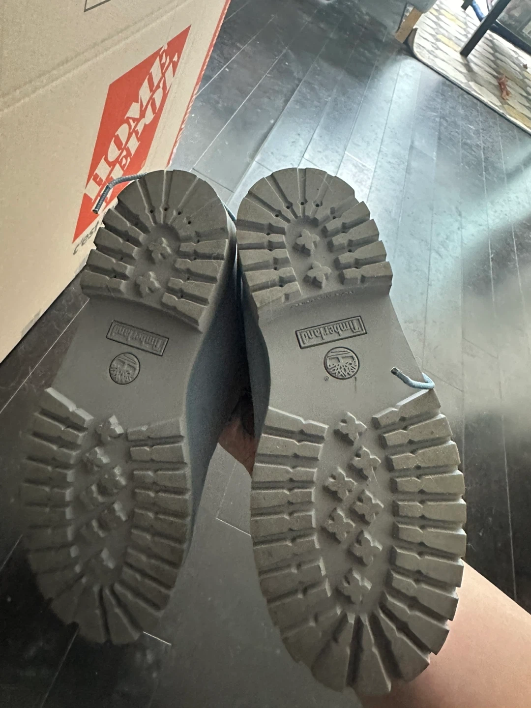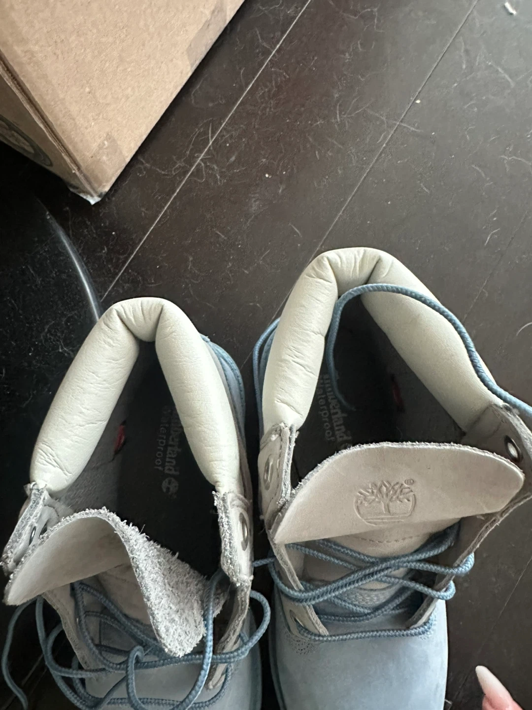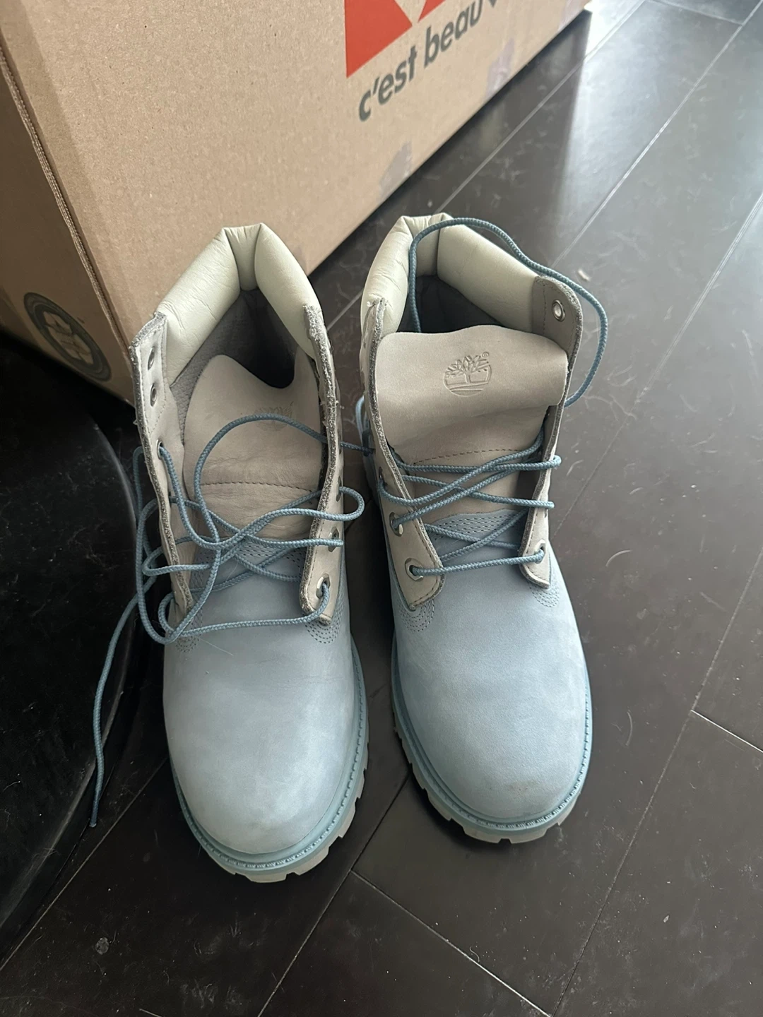 Timberland waterproof boots for boys. Made in Vietnam. These boots are a light blue colour. They feature the classic lug sole for good traction.