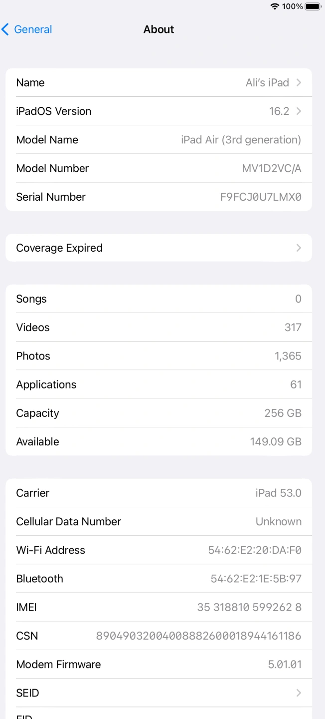 Used iPad Air 3rd generation. Space grey colour. 256 GB storage. Includes black protective case. Pre-owned. WiFi and cellular both. Charger and original box included.