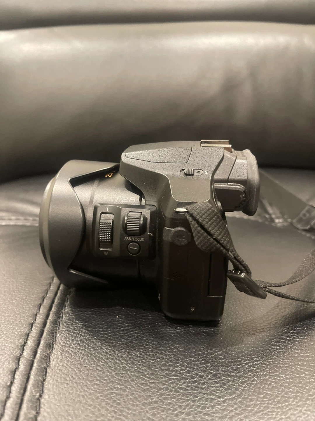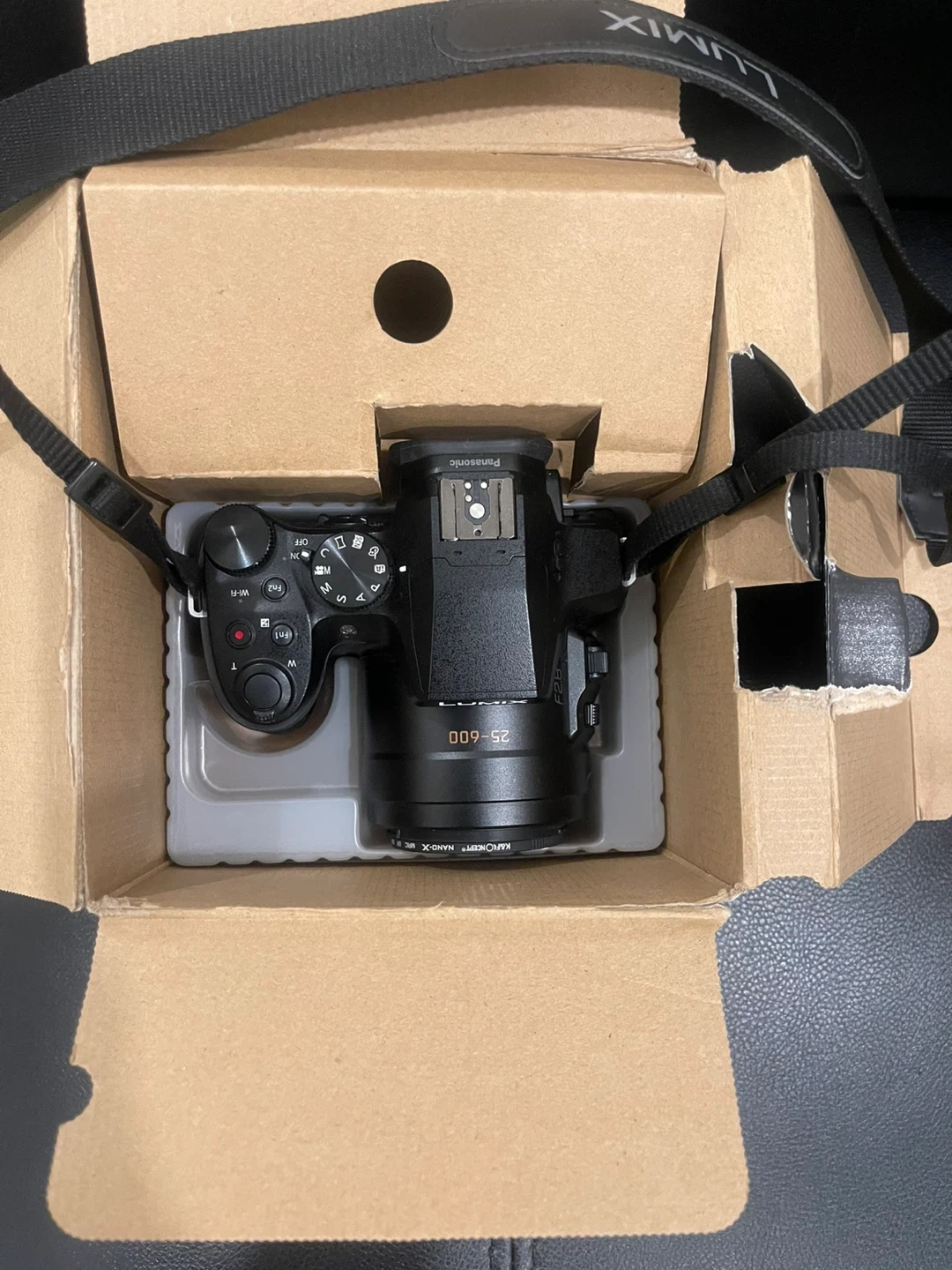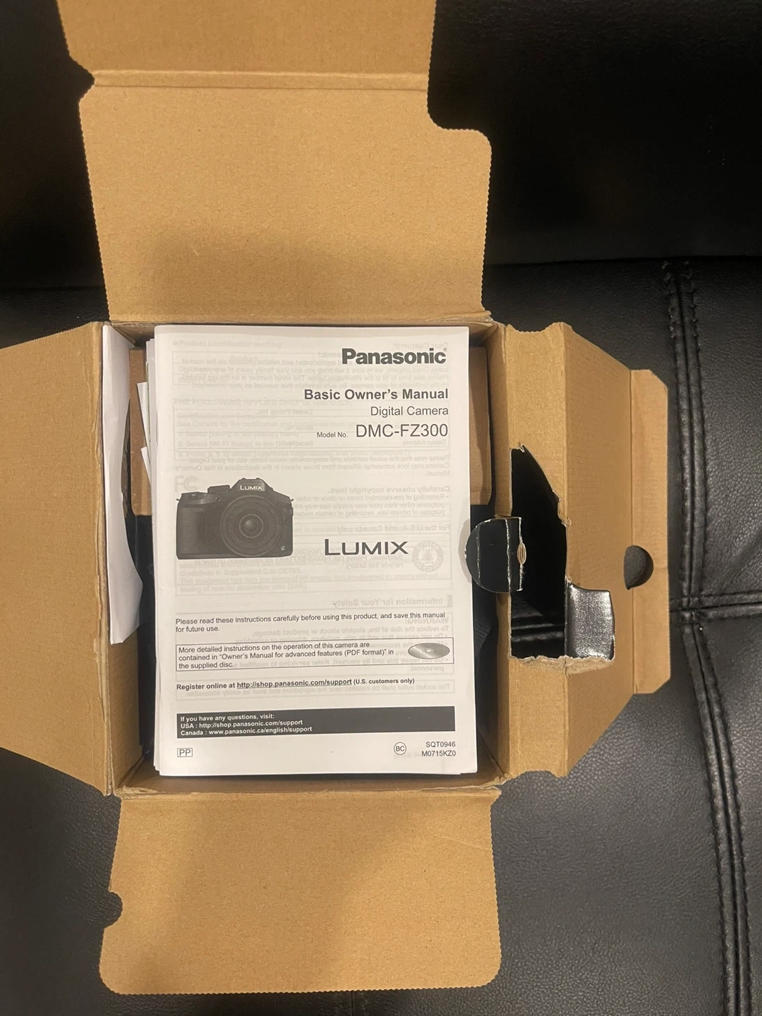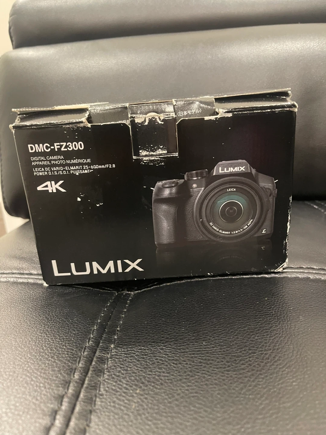 Selling a Panasonic Lumix DMC-FZ300 digital camera. It comes with the box and included components such as the charger and instructions. Great for capturing high-quality photos and videos!