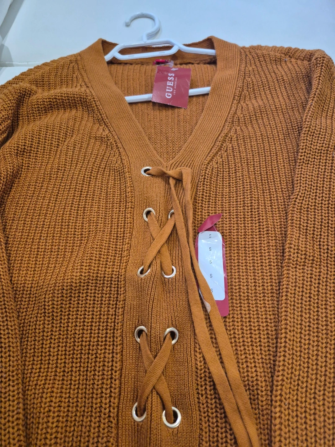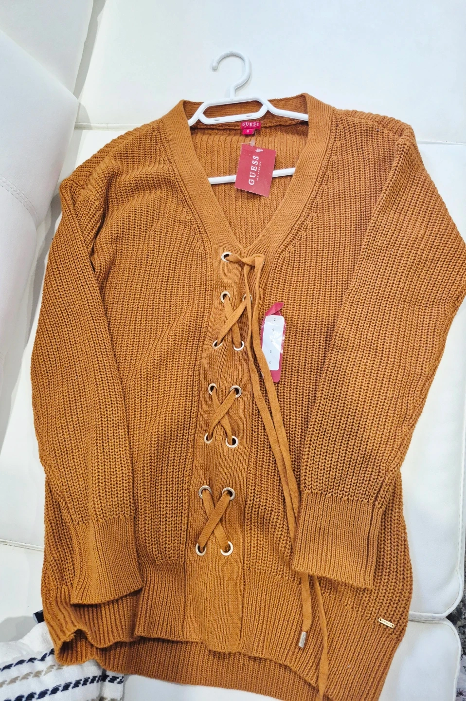 This is a Guess V-neck sweater with a lace-up front. It's a size small and features a ribbed knit texture. The colour is a warm rust or burnt orange.