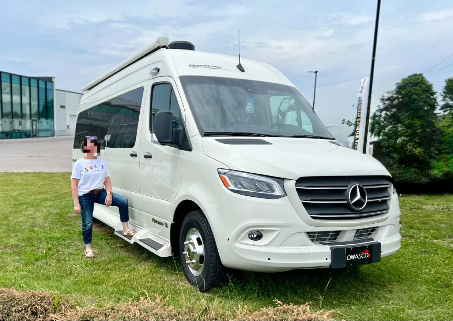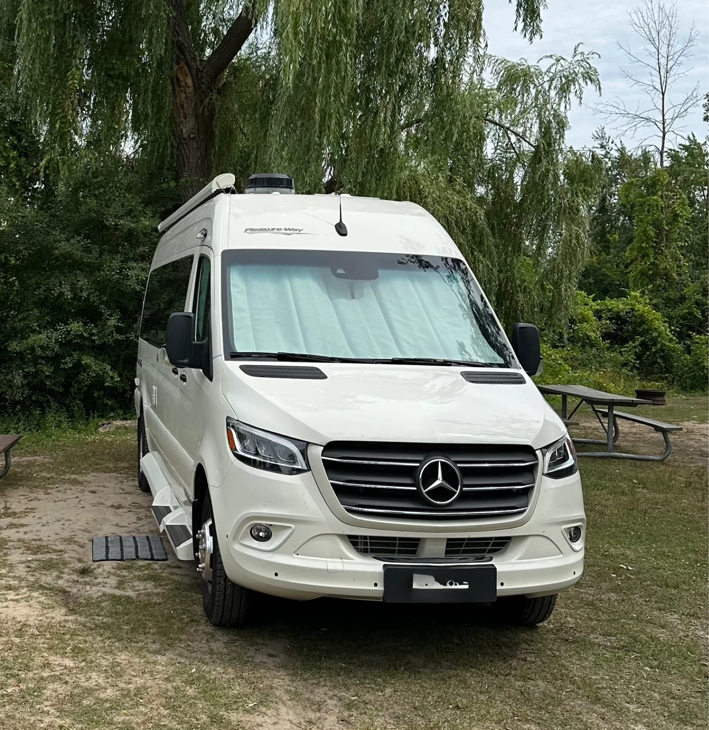 The 2024 Mercedes-Benz Pleasure-Way Plateau TS is a luxury Class B motorhome with tinted windows and an awning.