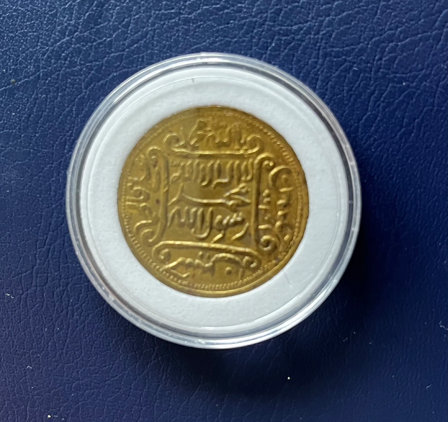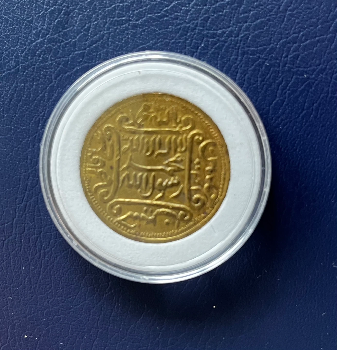 This is an ancient Islamic coin with intricate calligraphy on one side and an architectural design on the other. It's housed in a protective plastic case. This coin would be of interest to collectors of historical artefacts.