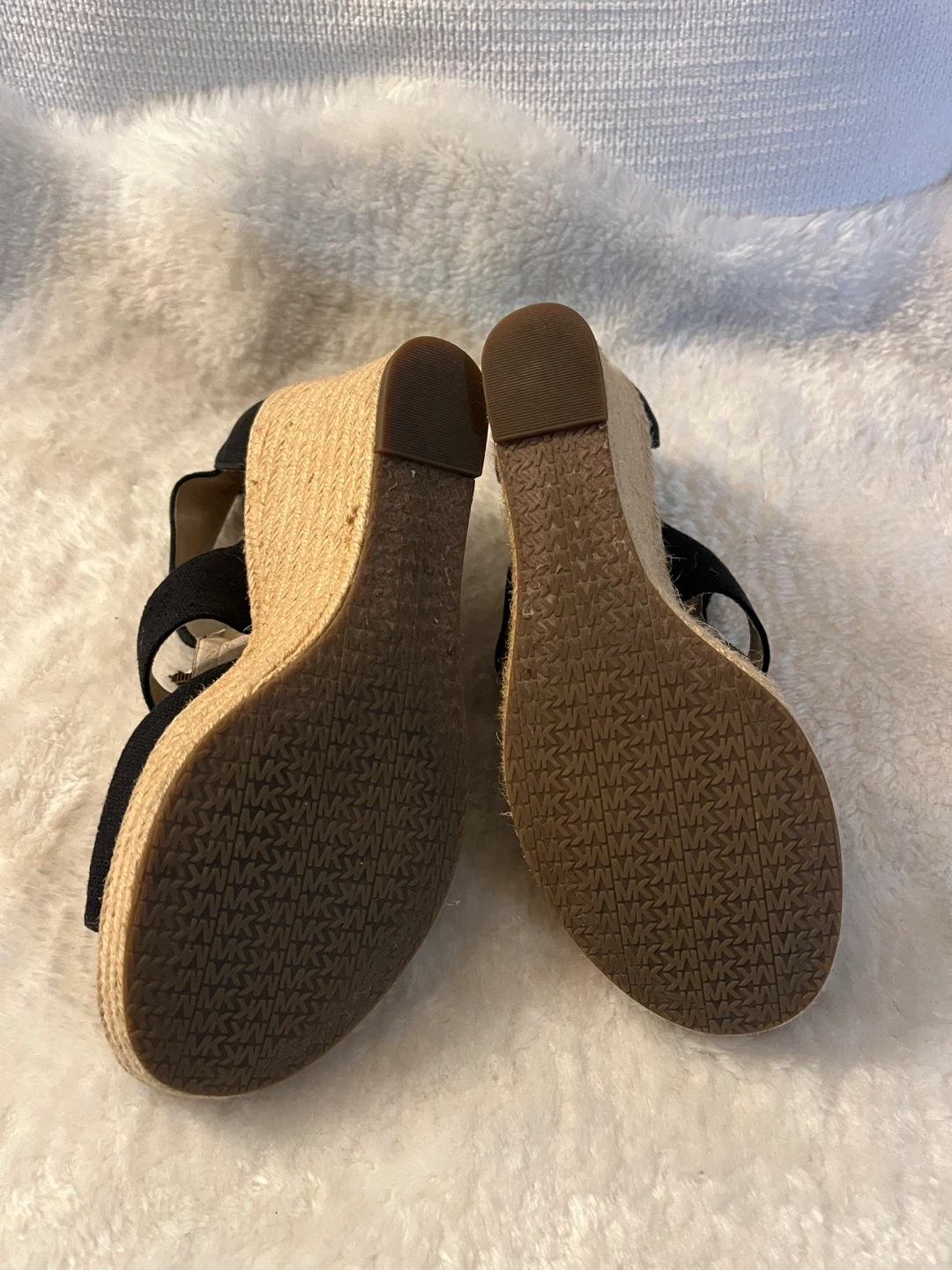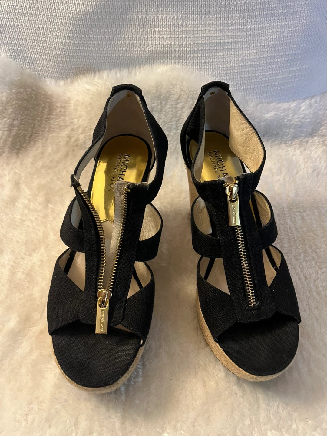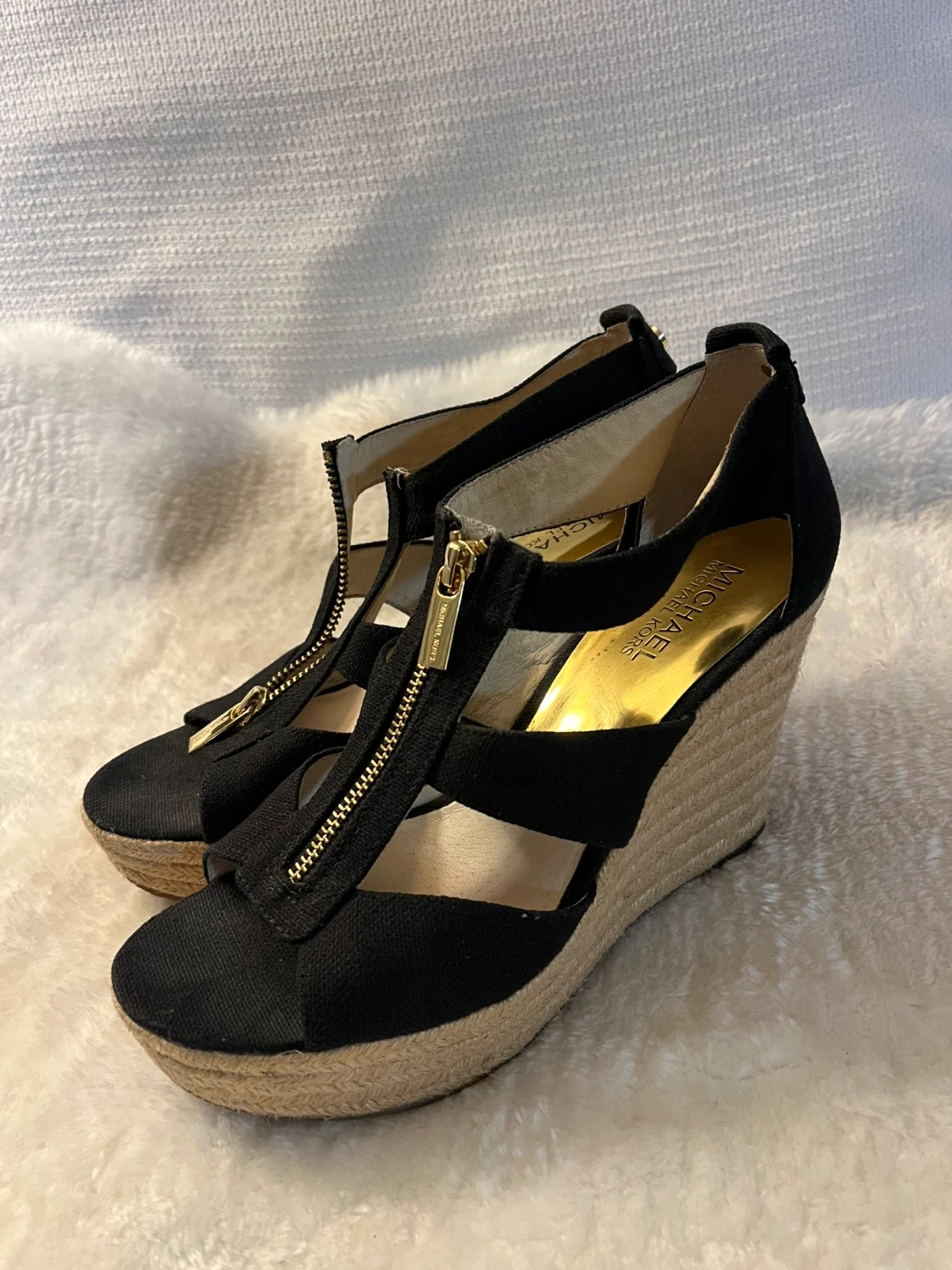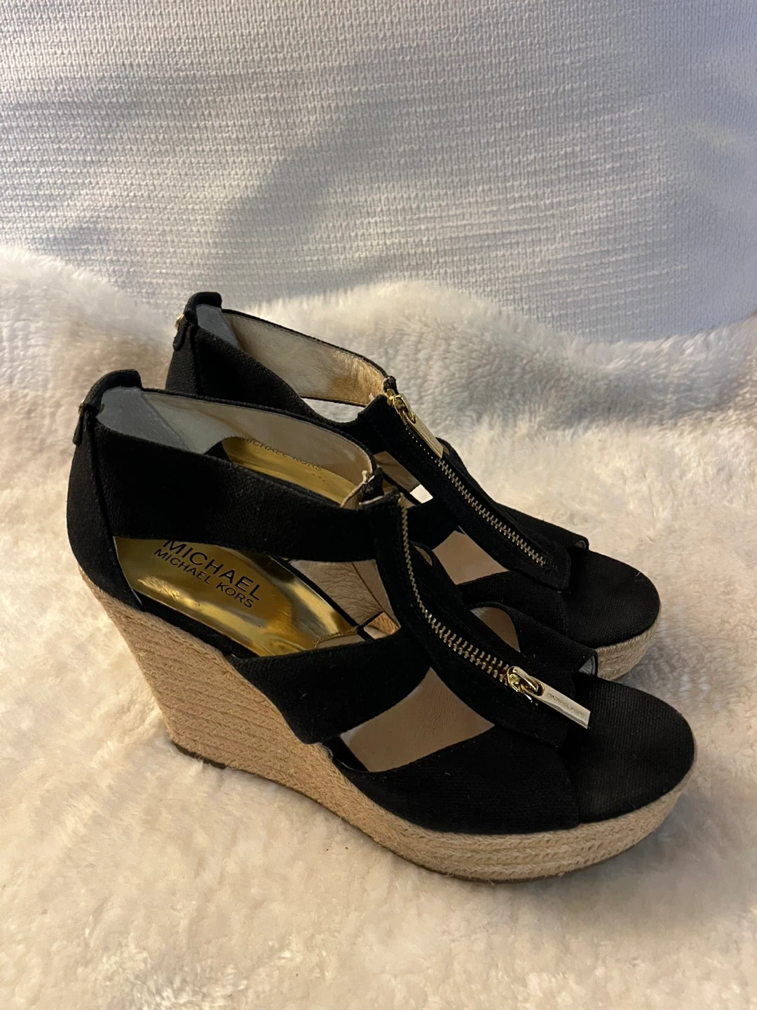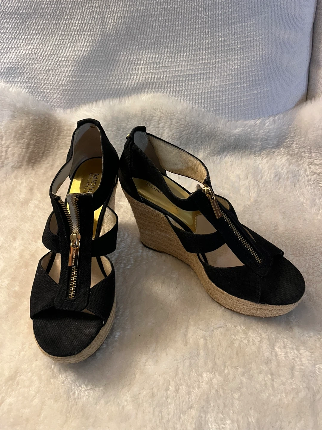Michael Kors black wedge espadrille leather sandals with a front zipper, canvas upper and a woven espadrille sole