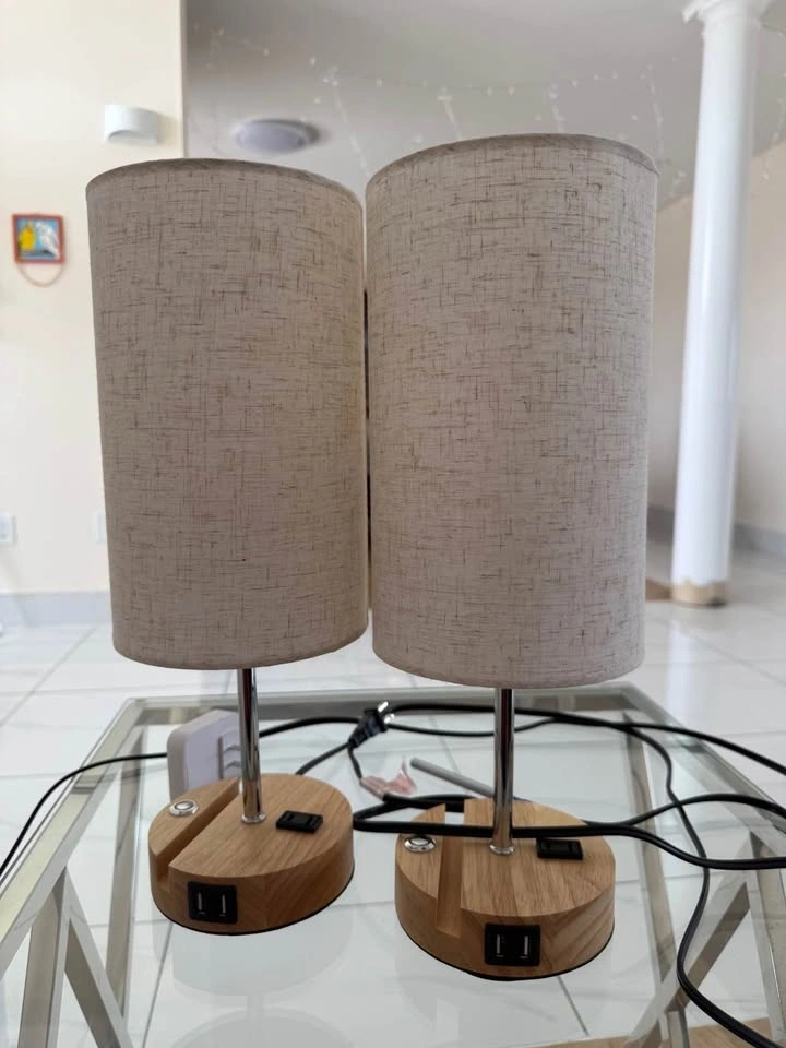 USB port table lamp, perfect for a sofa side table or bedside table. Features a soft-touch on/off and brightness adjustment switch. Comes with 2 USB ports and 1 plug option. Bulb included. $40 each. 10 available.