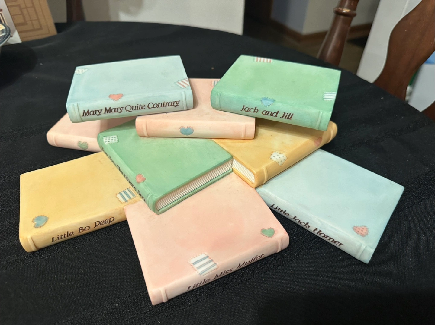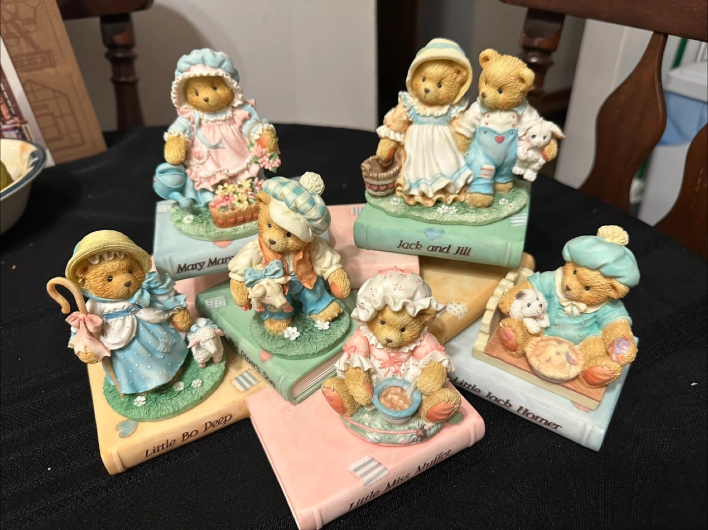 Selling a set of six adorable Enesco Nursery Rhyme Bear Figurines. Each figurine features a charming bear character sitting on a book-shaped base with a classic nursery rhyme title. They add a touch of whimsy to any room