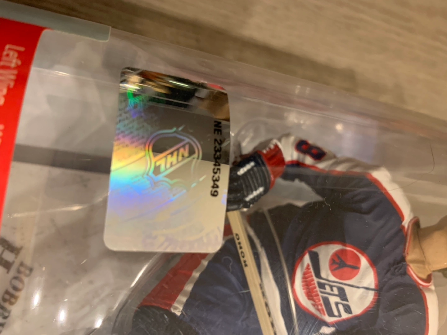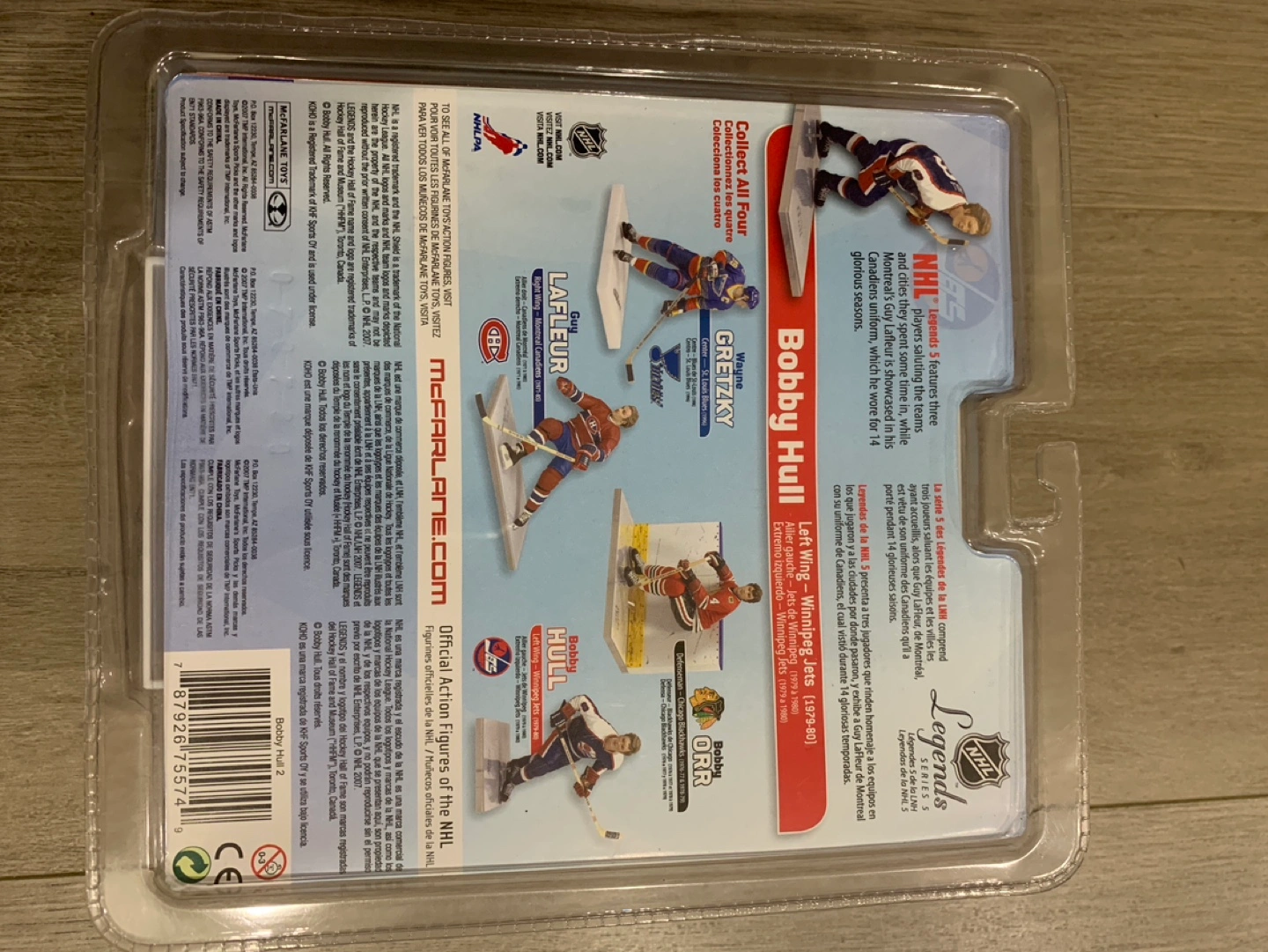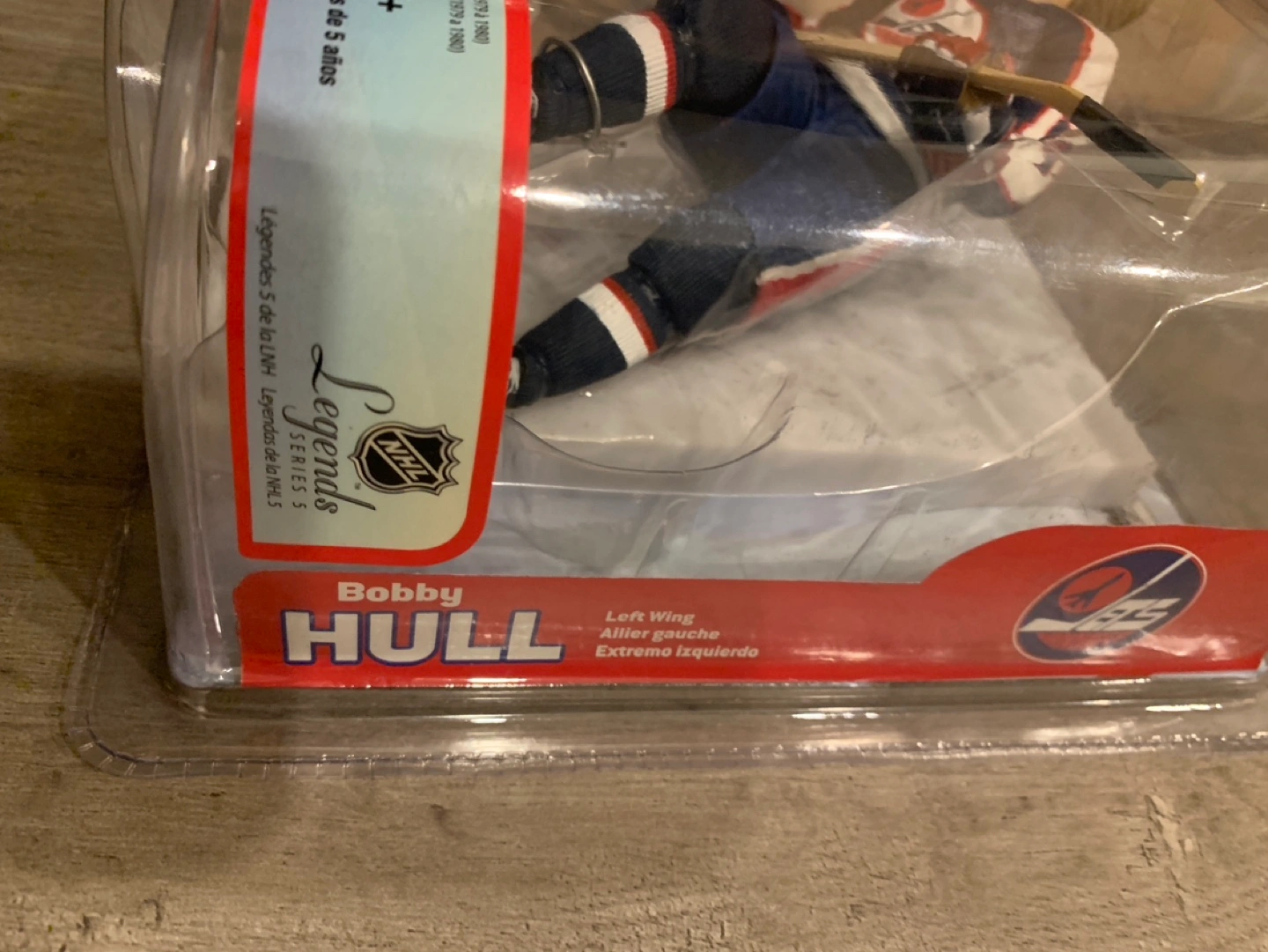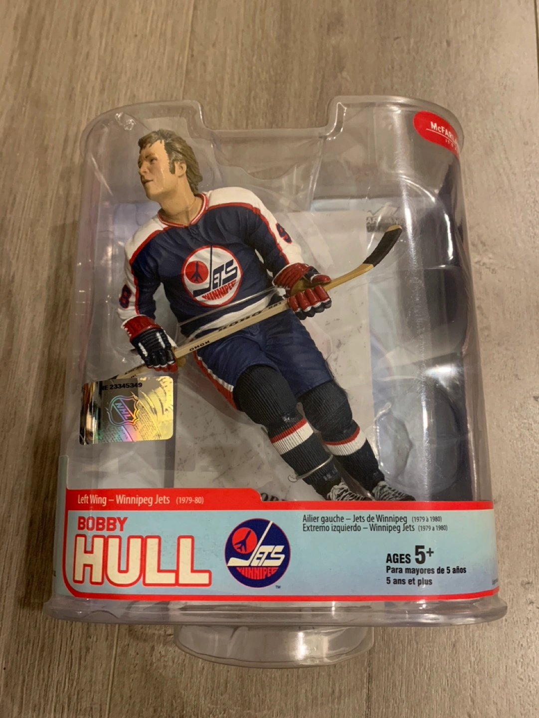 Collectible Bobby Hull Winnipeg Jets hockey player action figure. Part of the McFarlane NHL Legends Series 5. Figure in original packaging. Left wing. 1979-1980.