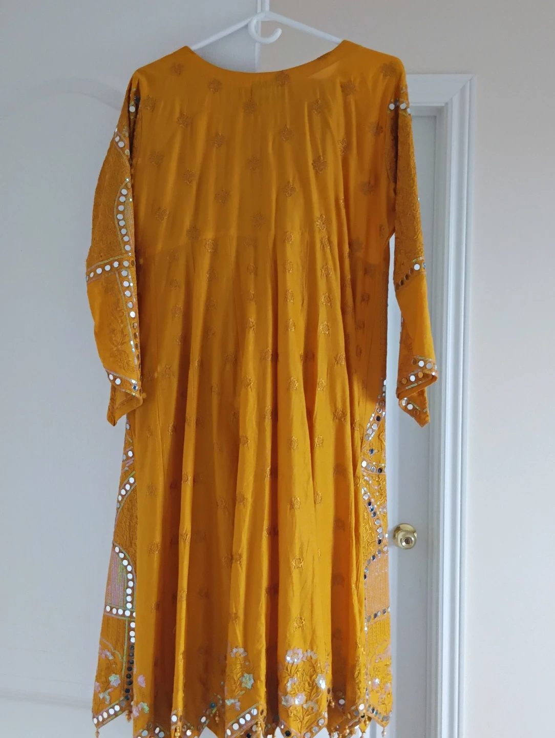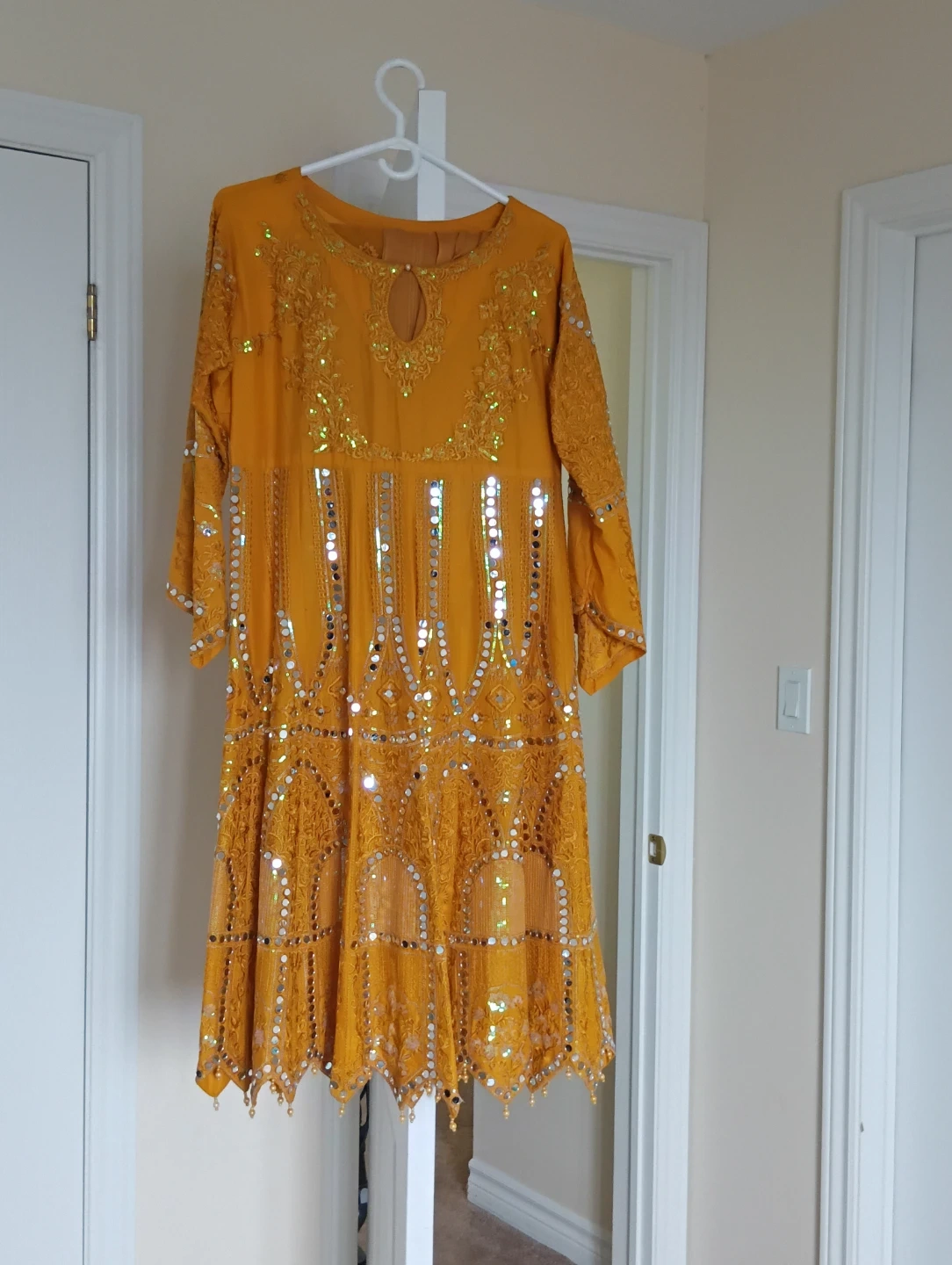 A beautiful yellow dress with intricate sequin and mirror embellishments. It features full sleeves and a knee-length cut. Perfect for festive occasions!