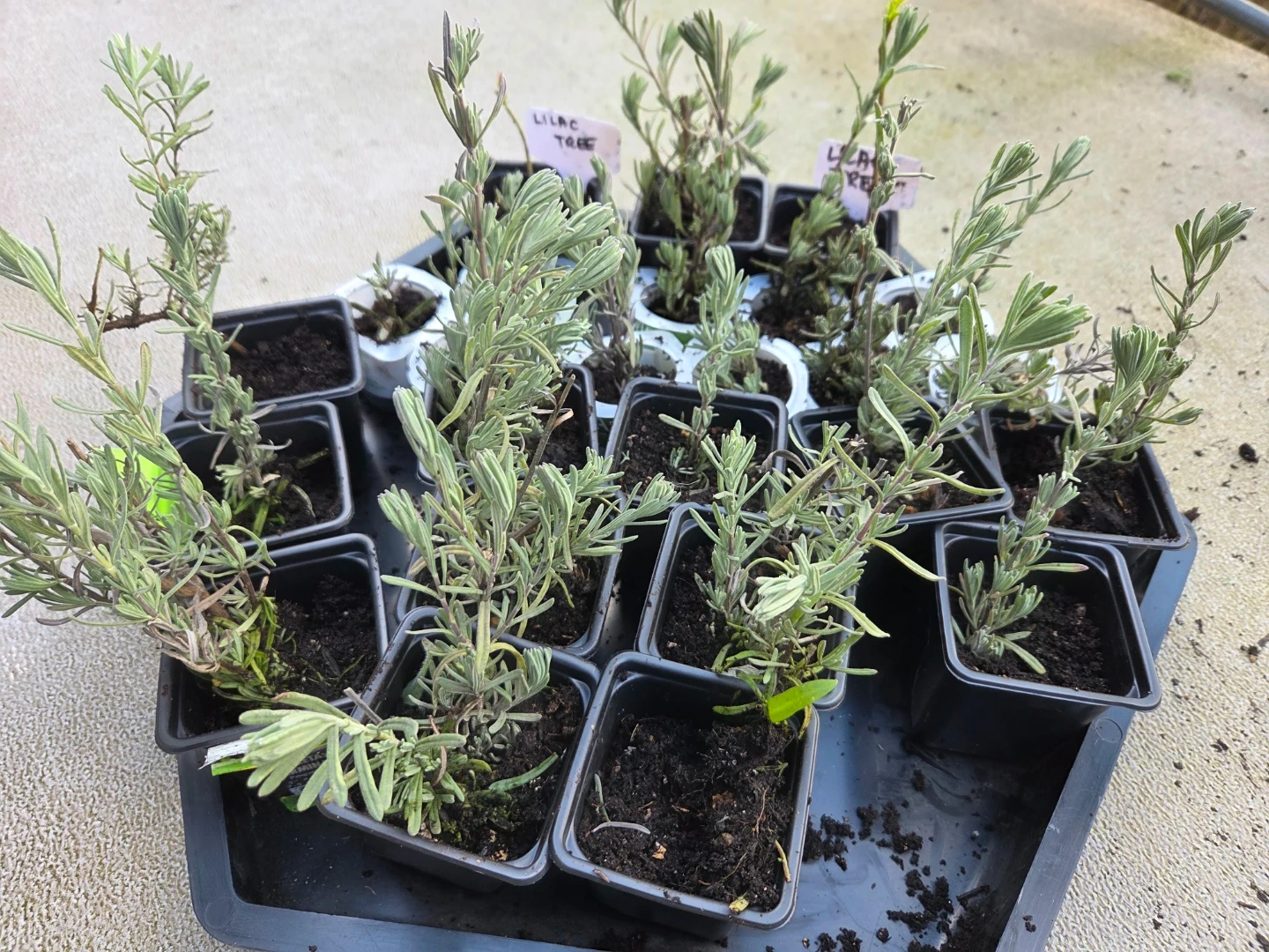 Nine lavender plant seedlings are ready for a new home. These young plants are in individual small pots. They're perfect for starting your own herb garden or for adding a fragrant touch to your outdoor space. Give them some sun and they'll grow beautifully! Naturally keeps away ants and pests!!
