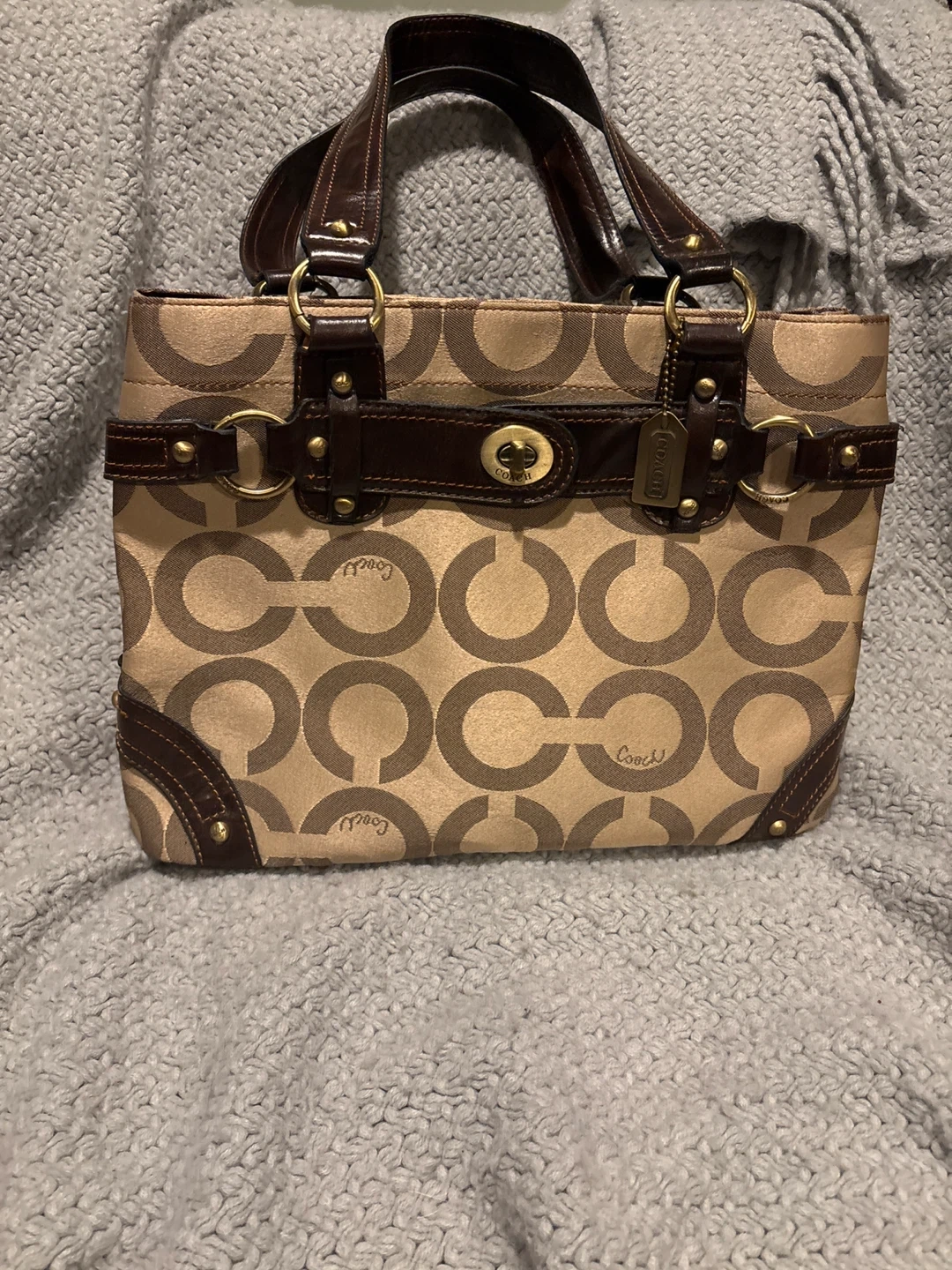 This is a classic Coach tote bag featuring the signature C monogram pattern. It's made with a durable canvas and leather trim. Great for everyday use, it holds essentials with style.